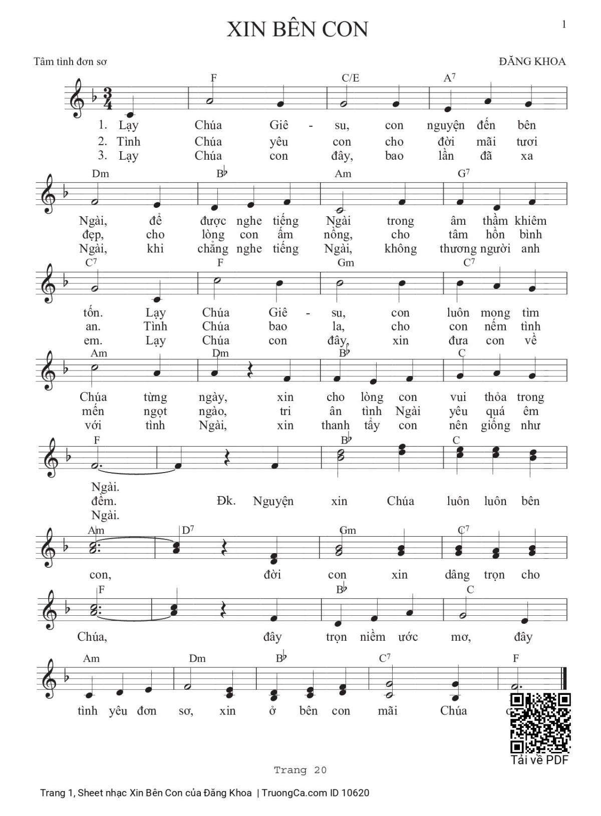 Điệp khúc. Nguyện xin Chúa luôn luôn bên con, đời con xin dâng trọn cho Chúa, đây trọn niềm ước mơ, đây tình yêu đơn sơ, xin ở bên con mãi Chúa ơi!