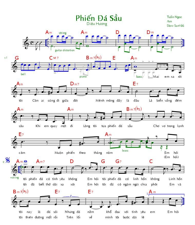Chọn nút dấu + để tăng tông lên nửa cung, nút dấu - để giảm tông xuống nửa cung. Rê chuột vào hợp âm để xem các thế bấm hợp âm của bài hát Phiến đá sầu.