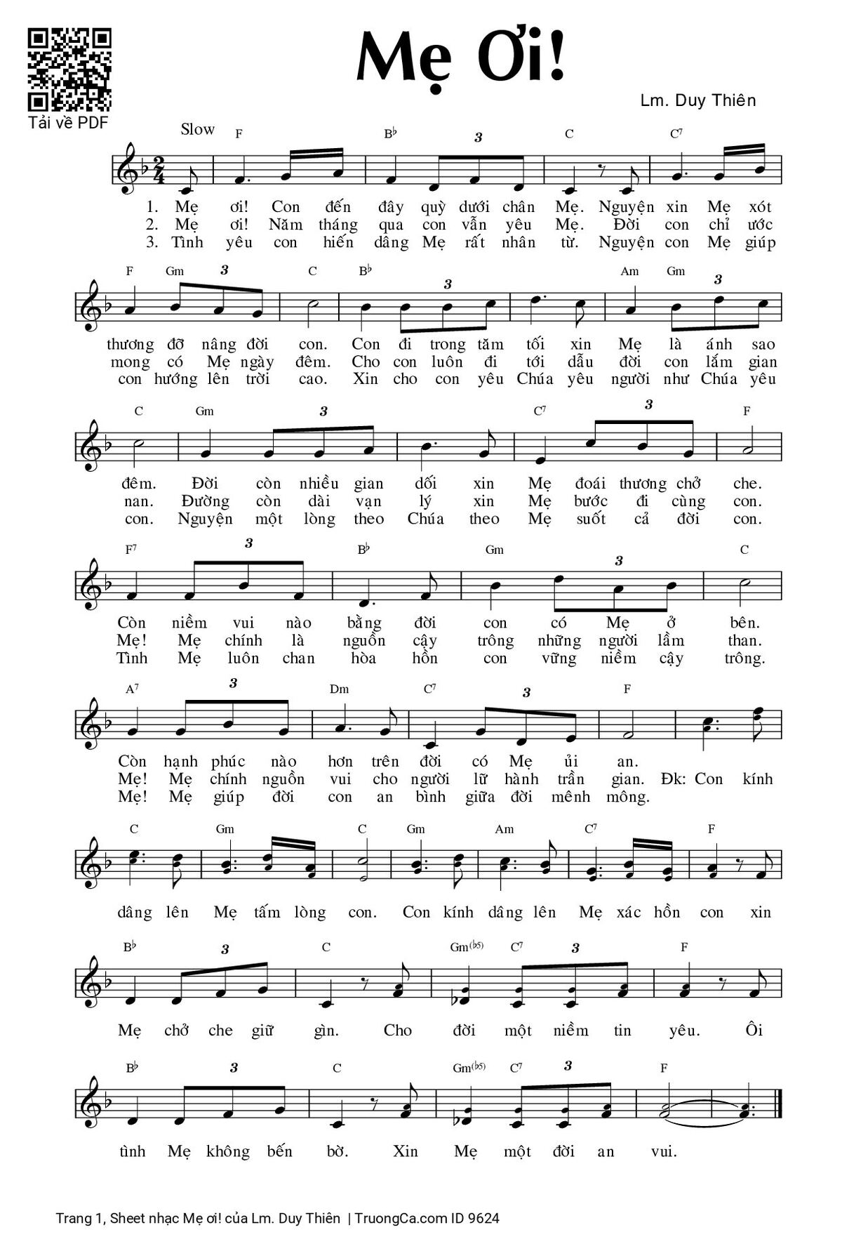 2. Mẹ ơi! Năm tháng qua con vẫn yêu Mẹ. Đời con chỉ ước mong có Mẹ ngày đêm. Cho con luôn đi tới dẫu đời con lắm gian nan. Đường còn dài vạn lý xin Mẹ bước đi cùng con. Mẹ! Mẹ chính là nguồn cậy trông những người lầm than. Mẹ! Mẹ chính nguồn vui cho người lữ hành trần gian.
