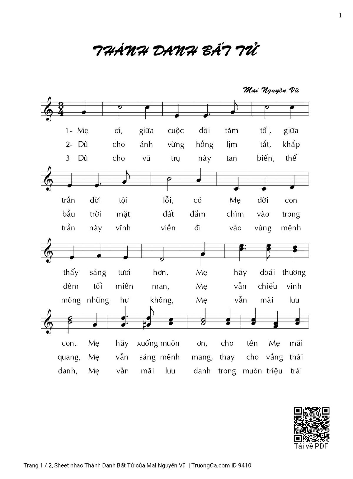 Điệp khúc. A - VÊ MA - RI - A tên Mẹ là vạn bài ca. A - VÊ MA - RI - A tên Mẹ là triệu đóa hoa. Muôn tinh tú long lanh kết thành vần MA - RI - A. Khắp trái đất tung hô tên Mẹ, Mẹ MA - RI - A.