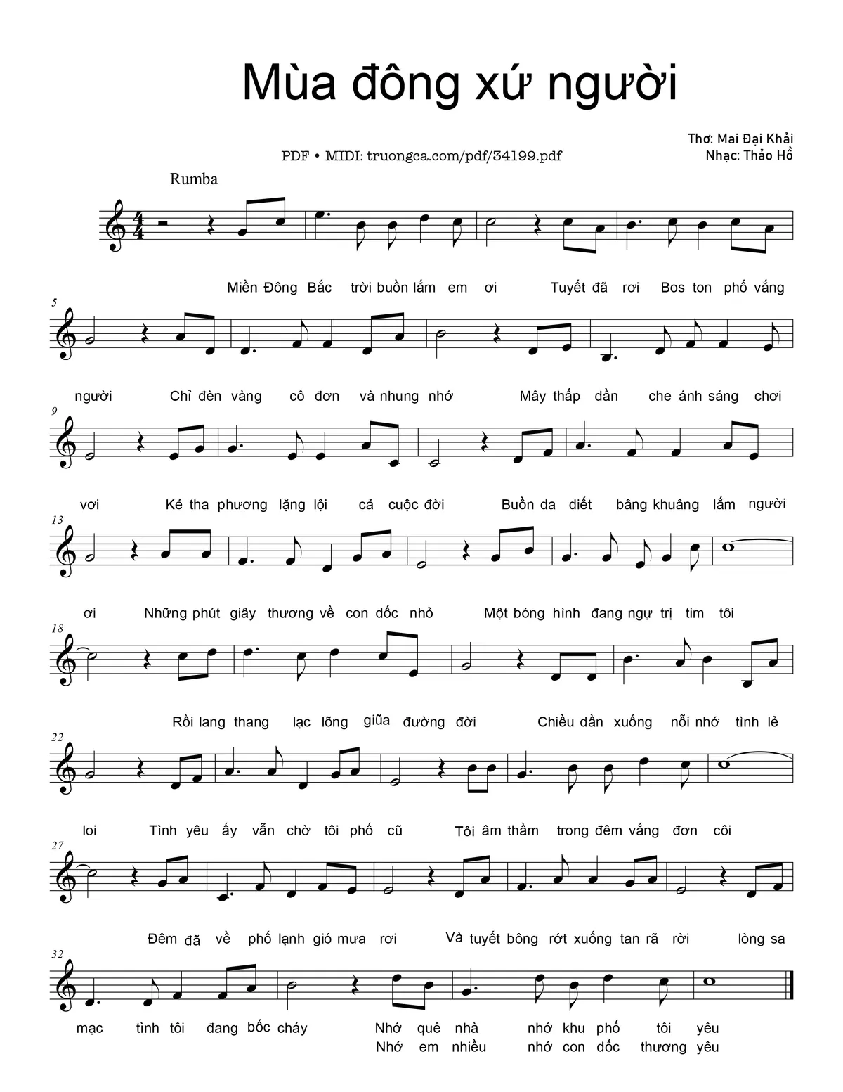 Thảo Hồ Miền Đông Bắc trời buồn lắm em ơi Tuyết đã rơi Bos ton phố vắng người [PDF] [Sheet] [Lời H.A] [Mp4/Midi]