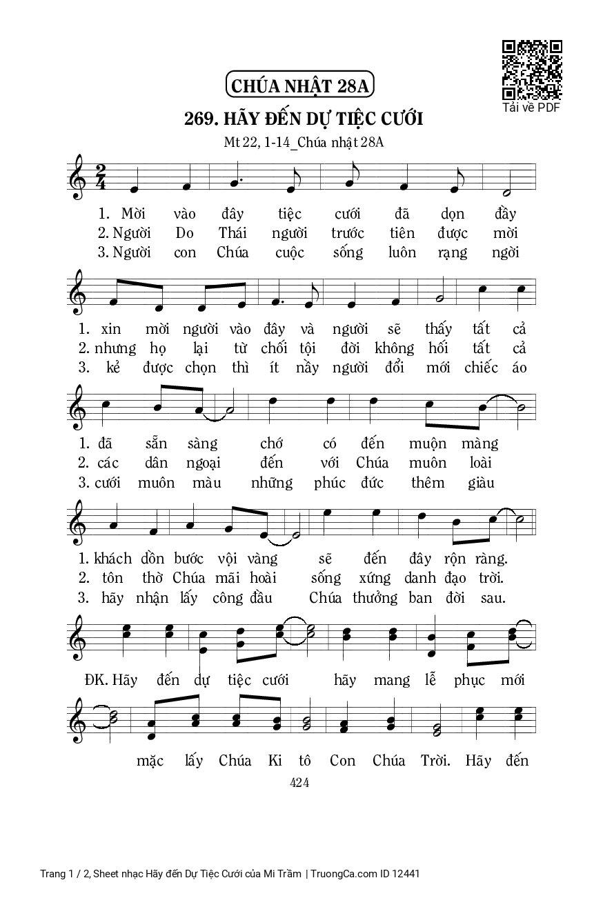 Điệp khúc. Hãy đến dự tiệc cưới, hãy mang lễ phục mới, mặc lấy Chúa Ki-tô Con Chúa Trời. Hãy đến dự tiệc cưới, hãy mang lễ phục mới, đời có Chúa vui tươi mãi rạng ngời.