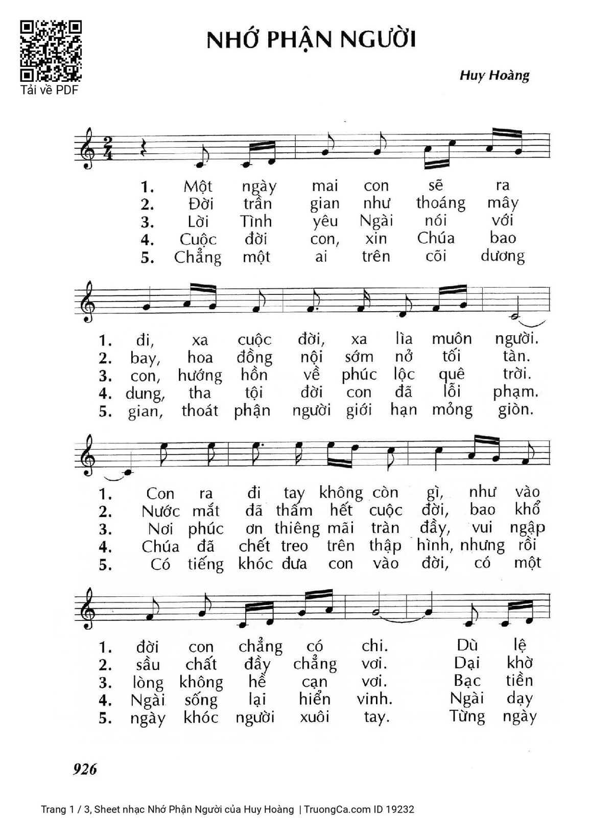 Điệp khúc: Này người ơi hãy nhớ lấy phận người, đã vào đời rồi có ngày ra đi. Bạc tiền ta không mang đi theo, thì người ơi lo tích luỹ làm chi. Ngày của Chúa sẽ đến sẽ đến, khi mọi người đưa tiễn ta ra mộ phần. Đợi chờ chi trong cơn đam mê, mau tỉnh thức nhẹ bước đi trên đường về.