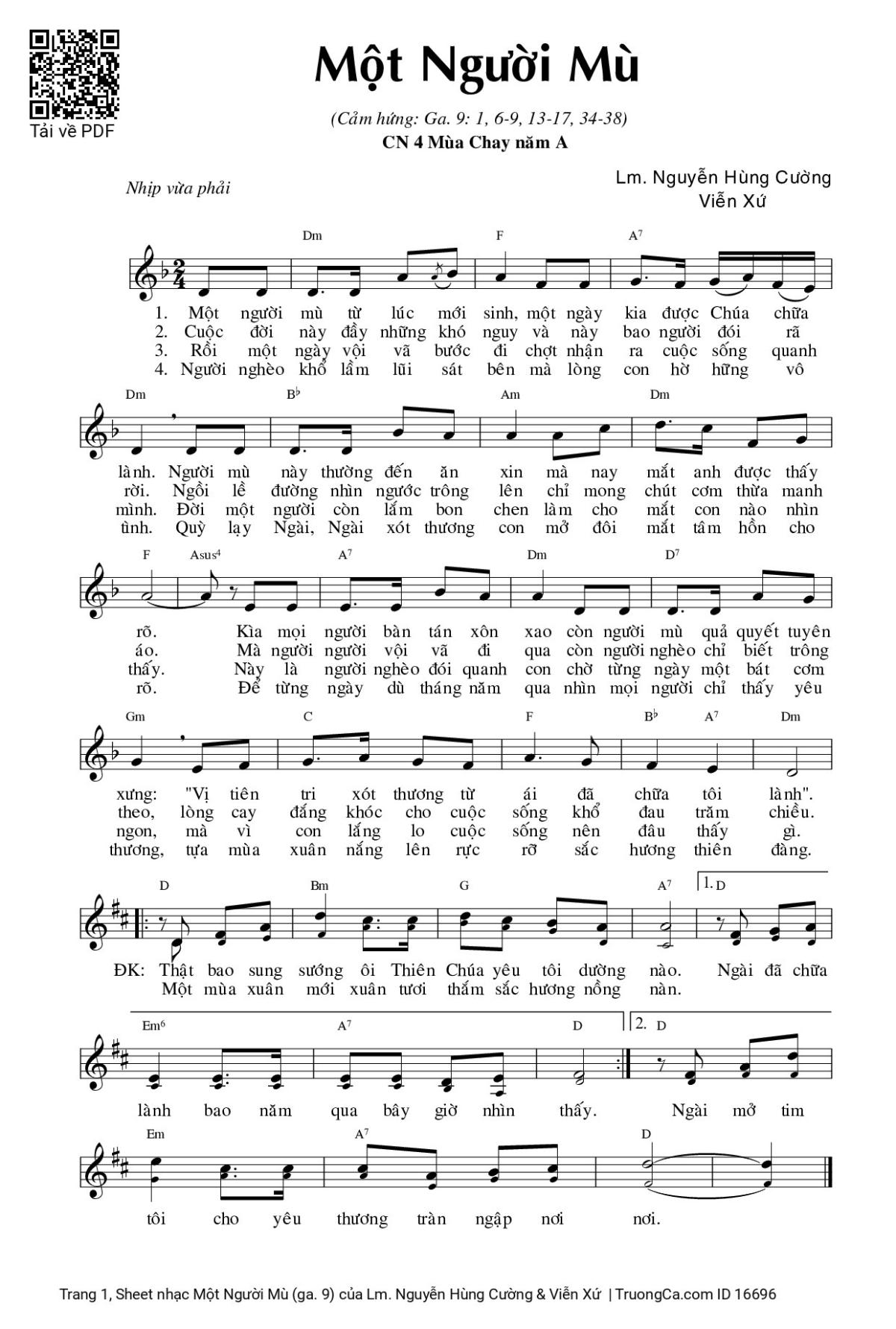 Chọn nút dấu + để tăng tông lên nửa cung, nút dấu - để giảm tông xuống nửa cung. Rê chuột vào hợp âm để xem các thế bấm hợp âm của bài hát Một Người Mù (ga. 9).