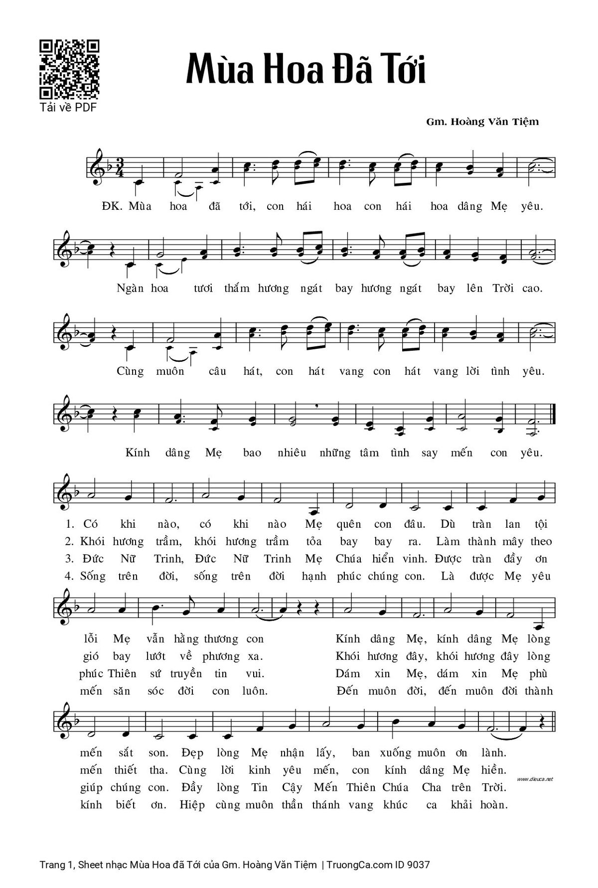 Điệp khúc. Mùa hoa đã tới, con hái hoa con hái hoa dâng Mẹ yêu. Ngàn hoa tươi thắm hương ngát bay hương ngát bay lên Trời cao. Cùng muôn câu hát, con hát vang con hát vang lời tình yêu. Kính dâng Mẹ bao nhiêu những tâm tình say mến con yêu.