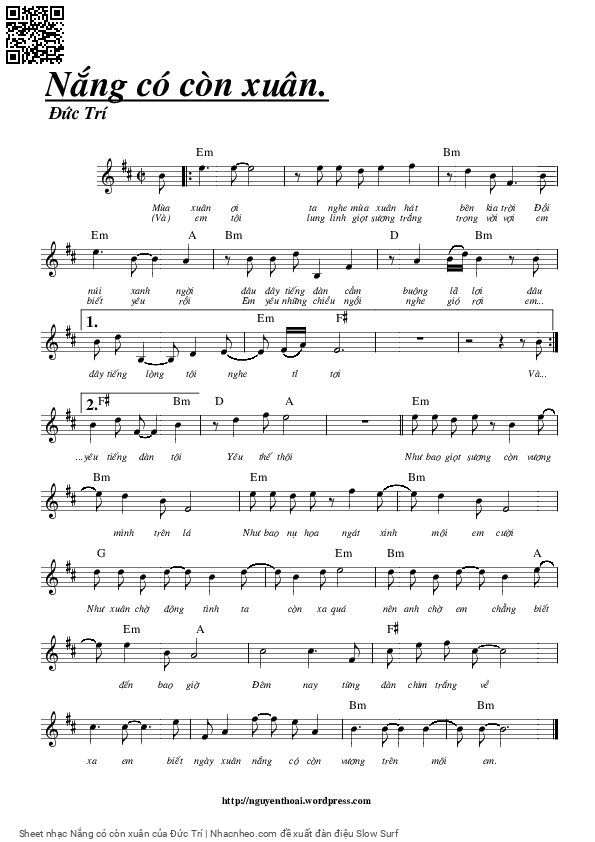 Phần nghe hát Nắng có còn xuân (Đức Trí) được nhúng từ Youtube, Musescore hoặc link ngoài và chịu sự kiểm soát bản quyền của bên thứ ba đó, vì vậy có thể bị xóa hoặc chèn quảng cáo bất kỳ lúc nào. Nếu bạn không nghe - xem được ca sĩ hát tức là đã bị Youtube hoặc Musescore kiểm soát.