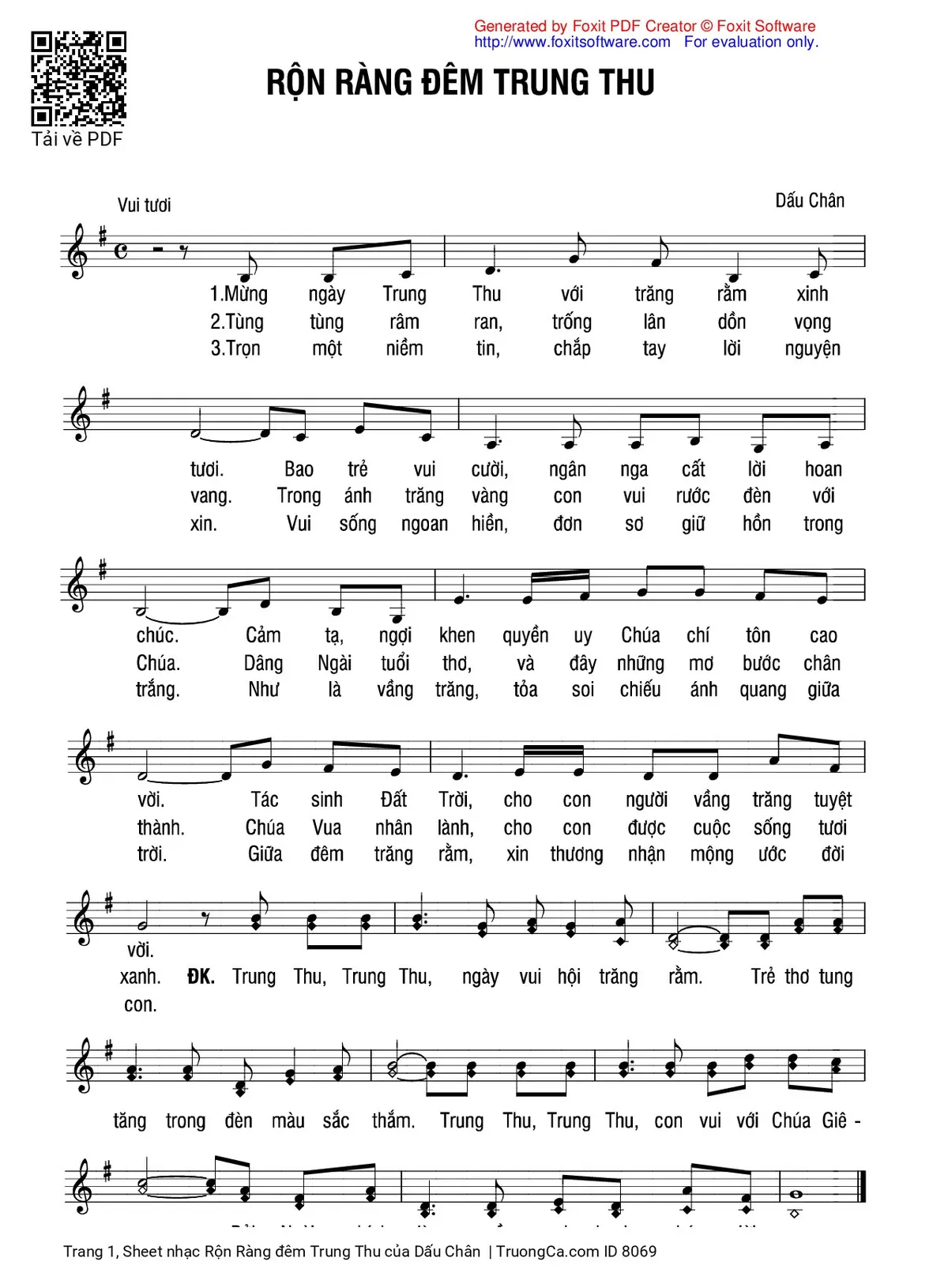 1) Mừng ngày Trung Thu với trăng rằm xinh tươi. Bao trẻ vui cười, ngân nga cất lời hoan chúc. Cảm tạ, ngợi khen quyền uy Chúa chí tôn cao vời. Tác sinh Đất Trời, cho con người vầng trăng tuyệt vời.