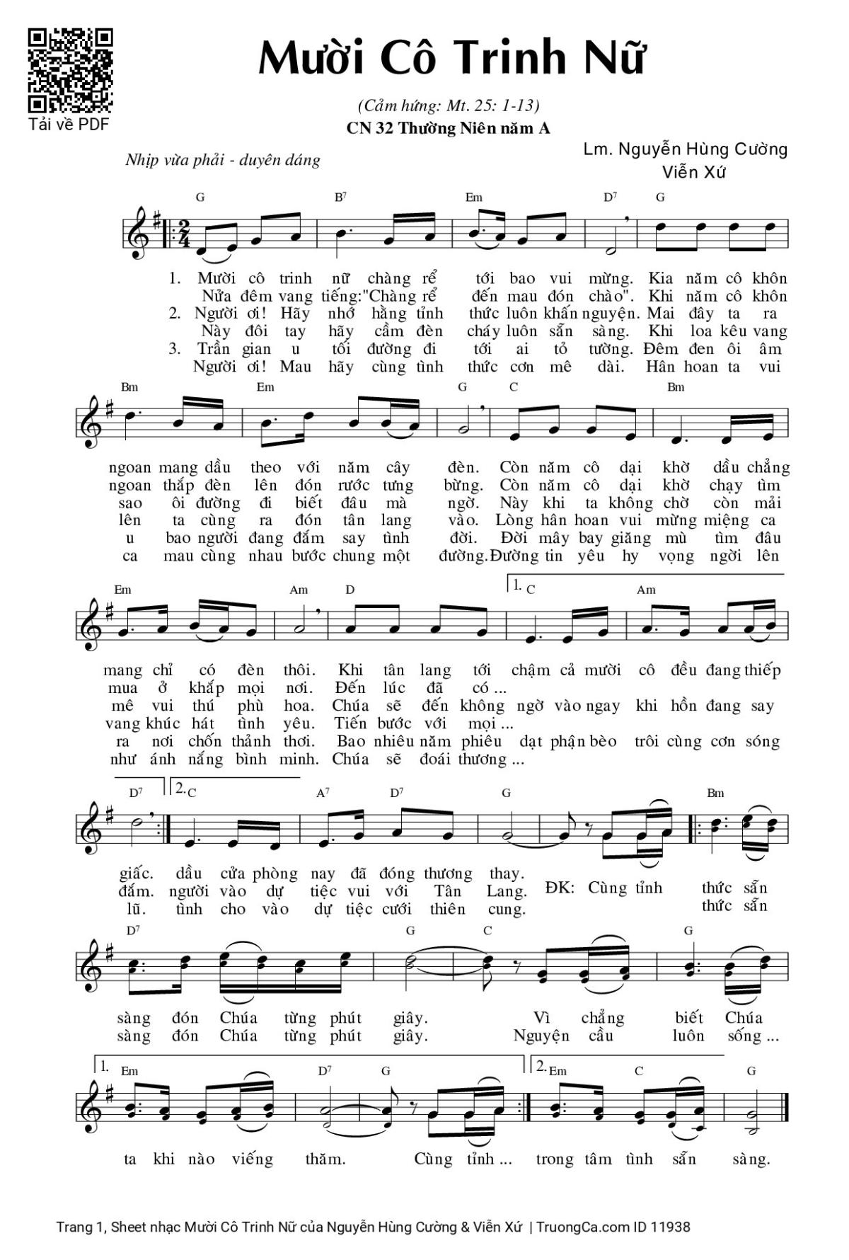 Phần nghe hát Mười Cô Trinh Nữ (Nguyễn Hùng Cường & Viễn Xứ) được nhúng từ Youtube, Musescore hoặc link ngoài và chịu sự kiểm soát bản quyền của bên thứ ba đó, vì vậy có thể bị xóa hoặc chèn quảng cáo bất kỳ lúc nào. Nếu bạn không nghe - xem được ca sĩ hát tức là đã bị Youtube hoặc Musescore kiểm soát.