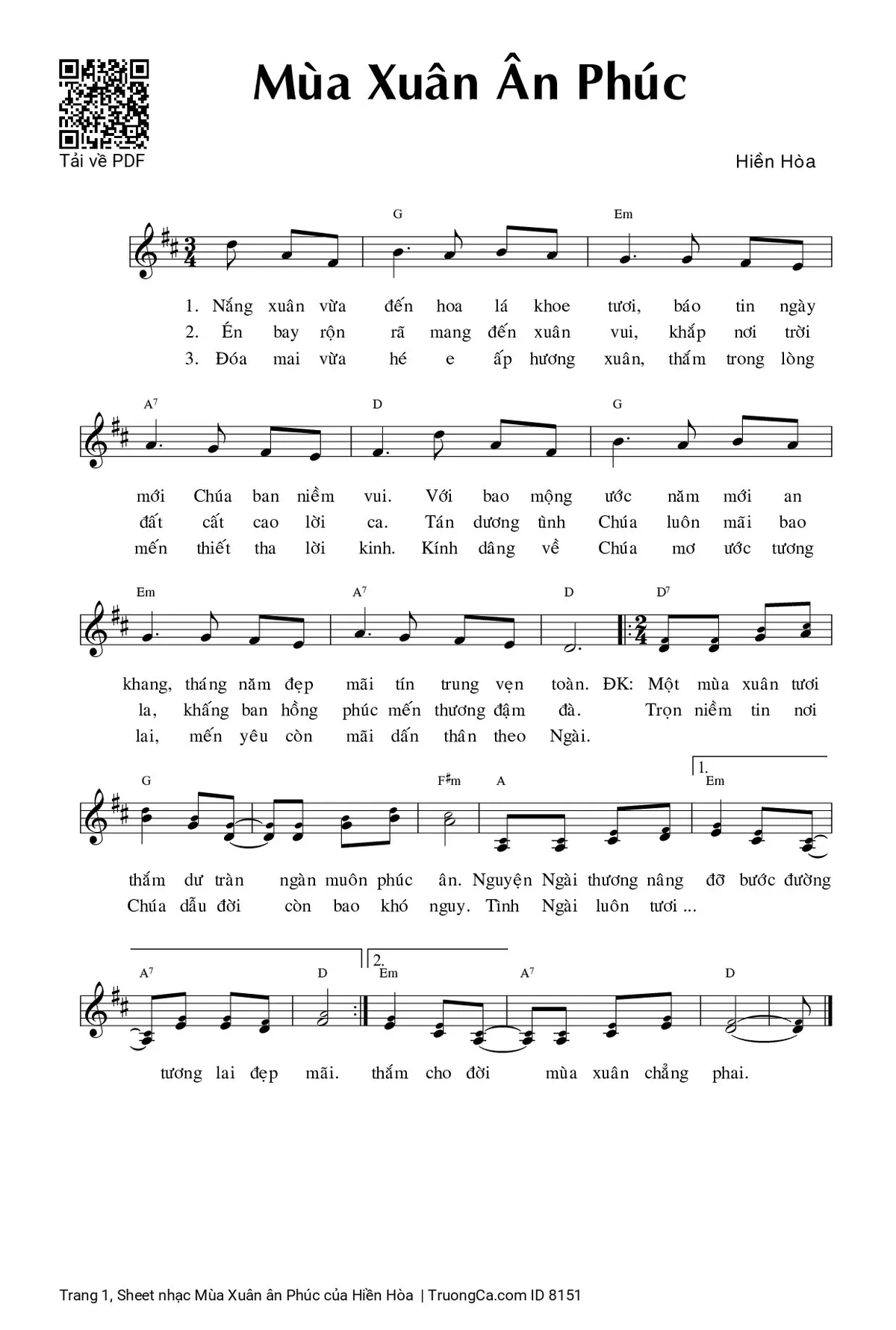 Hiền Hòa Nắng xuân vừa đến hoa lá khoe tươi báo tin ngày mới Chúa ban niềm vui [PDF] [Sheet] [Lời H.A] [Mp4/Midi]