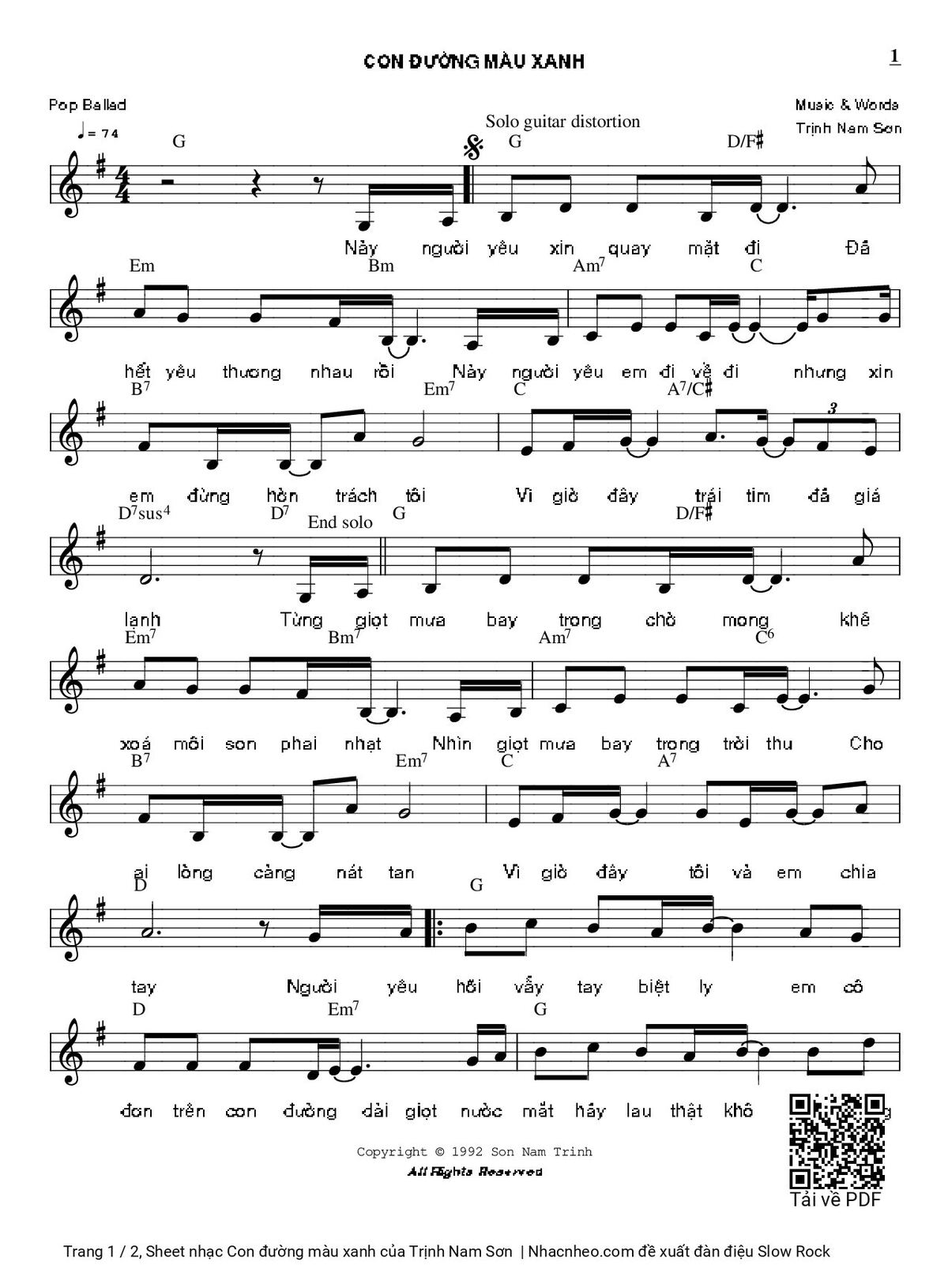 Chọn nút dấu + để tăng tông lên nửa cung, nút dấu - để giảm tông xuống nửa cung. Rê chuột vào hợp âm để xem các thế bấm hợp âm của bài hát Con đường màu xanh.