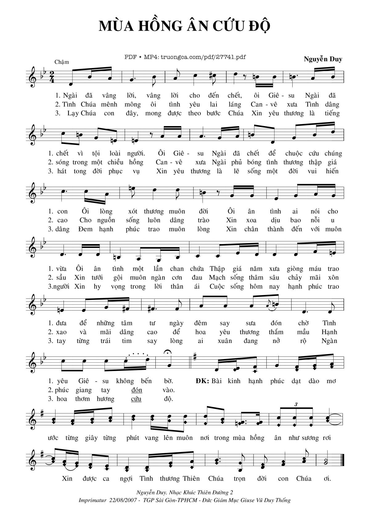 Phần nghe hát Mùa Hồng Ân Cứu Độ (Nguyễn Duy) được nhúng từ Youtube, Musescore hoặc link ngoài và chịu sự kiểm soát bản quyền của bên thứ ba đó, vì vậy có thể bị xóa hoặc chèn quảng cáo bất kỳ lúc nào. Nếu bạn không nghe - xem được ca sĩ hát tức là đã bị Youtube hoặc Musescore kiểm soát.