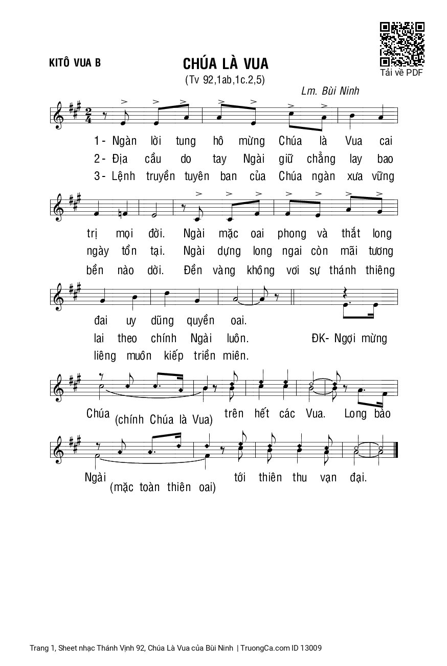 Phần nghe hát Thánh Vịnh 92, Chúa Là Vua (Bùi Ninh) được nhúng từ Youtube, Musescore hoặc link ngoài và chịu sự kiểm soát bản quyền của bên thứ ba đó, vì vậy có thể bị xóa hoặc chèn quảng cáo bất kỳ lúc nào. Nếu bạn không nghe - xem được ca sĩ hát tức là đã bị Youtube hoặc Musescore kiểm soát.