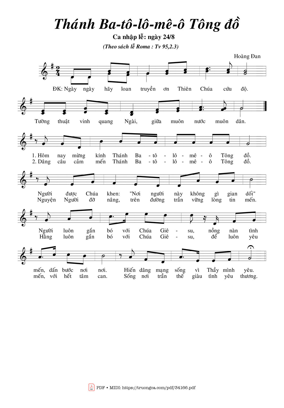 2. Dâng câu cảm mến Thánh Ba-tô-lô-mê-ô Tông đồ. Nguyện Người đỡ nâng trên đường trần vững lòng tin mến. Hằng luôn gắn bó với Chúa Giê-su, để luôn yêu mến với hết tâm can. Sông nơi trần thế giàu tình yêu thương.
