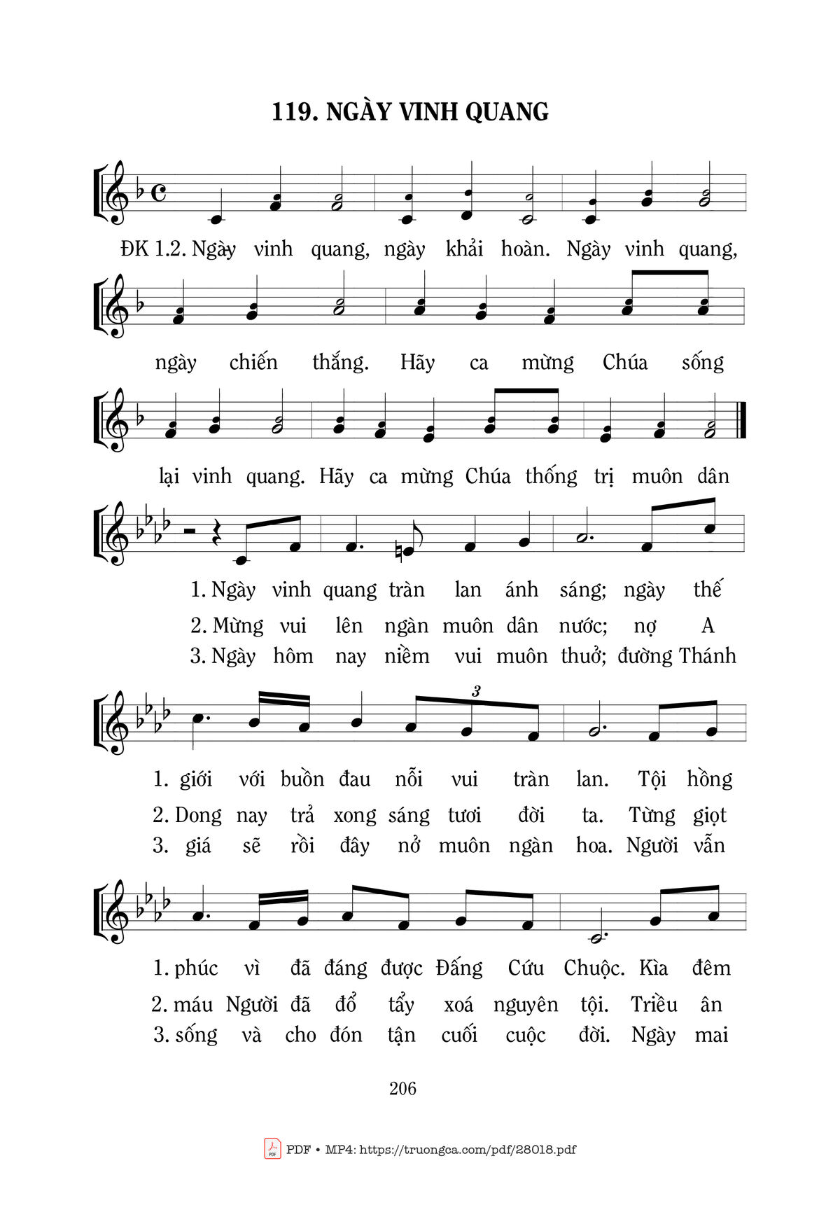 Điệp khúc. 1,2- Ngày vinh quang ngày khải hoàn. Ngày vinh quang ngày chiến thắng. Hãy ca mừng Chúa sống lại vinh quang. Hãy ca mừng Chúa thống trị muôn dân.