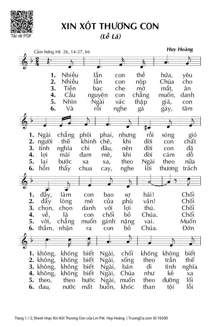 Điệp khúc. Xin thương, thương xót con, lạy Chúa xót thương con, bao lần đã phản bội tình Chúa. Xin thương thương xót con, thứ tha lỗi lầm con, bao phen không trọn tình với Ngài.