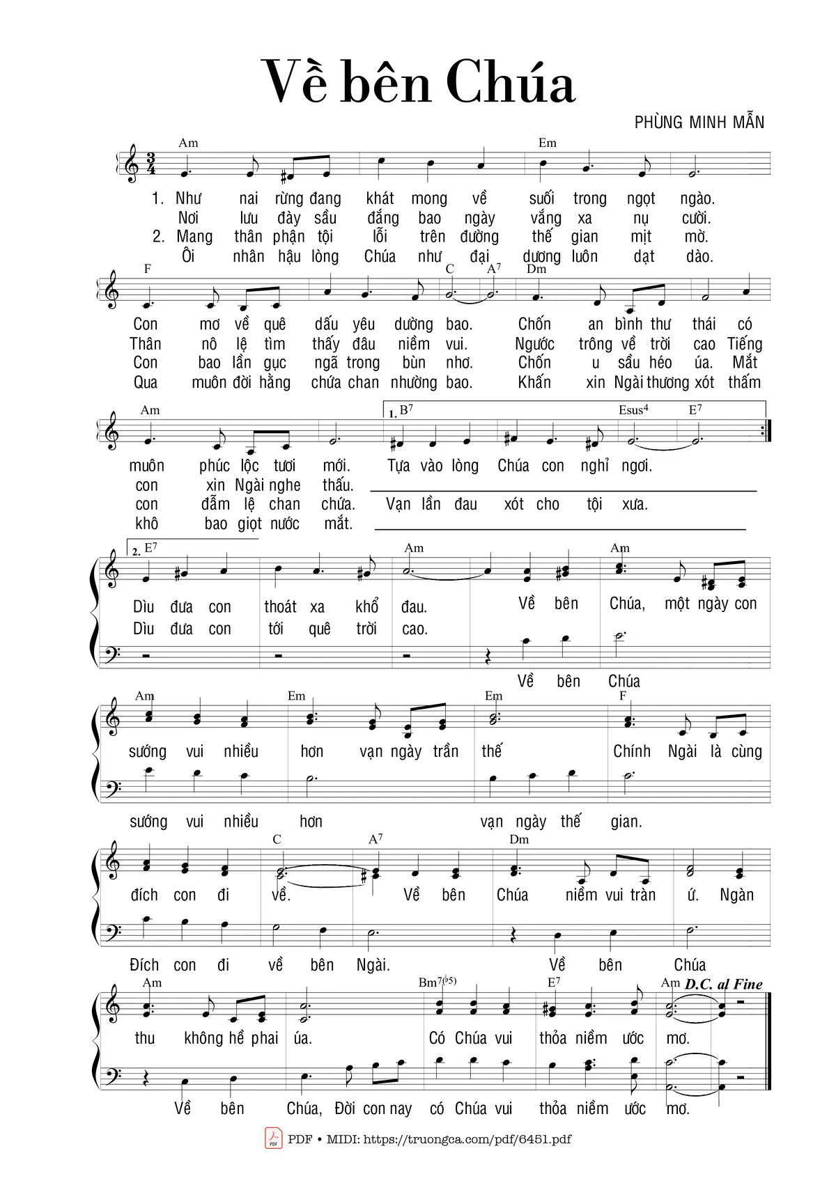 Phần nghe hát Về bên Chúa (Phùng Minh Mẫn) được nhúng từ Youtube, Musescore hoặc link ngoài và chịu sự kiểm soát bản quyền của bên thứ ba đó, vì vậy có thể bị xóa hoặc chèn quảng cáo bất kỳ lúc nào. Nếu bạn không nghe - xem được ca sĩ hát tức là đã bị Youtube hoặc Musescore kiểm soát.