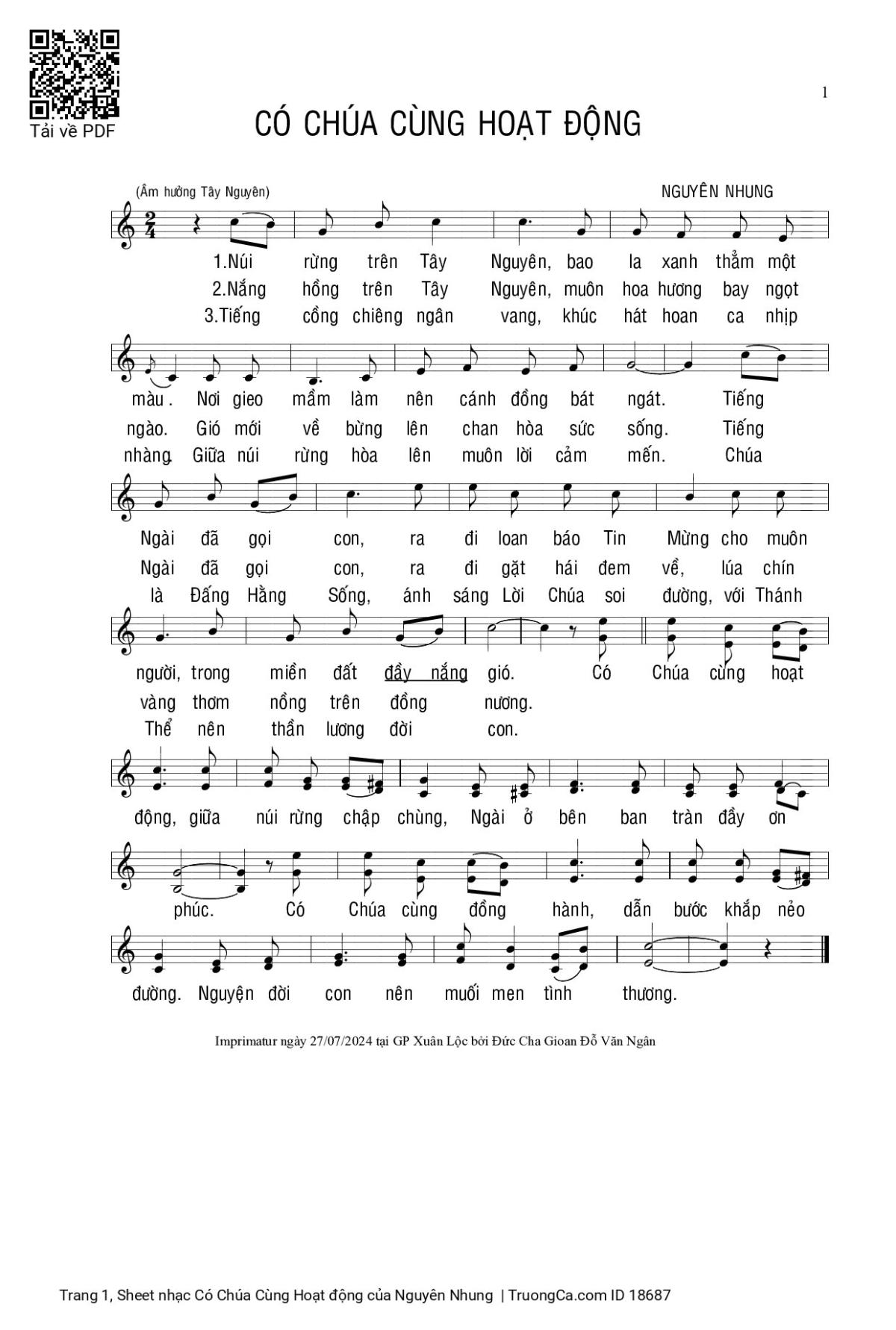Điệp khúc. Có Chúa cùng hoạt động giữa núi rừng chập chùng. Ngài ở bên ban tràn đầy ơn phúc. Có Chúa cùng đồng hành dẫn bước khắp nẻo đường. Nguyện đời con nên muối men tình thương.
