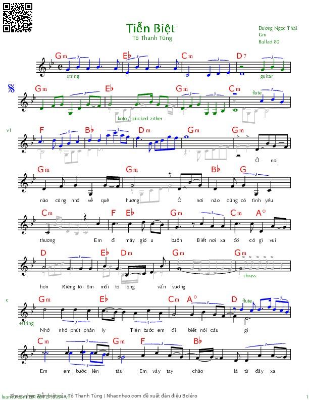 Chọn nút dấu + để tăng tông lên nửa cung, nút dấu - để giảm tông xuống nửa cung. Rê chuột vào hợp âm để xem các thế bấm hợp âm của bài hát Tiễn biệt.
