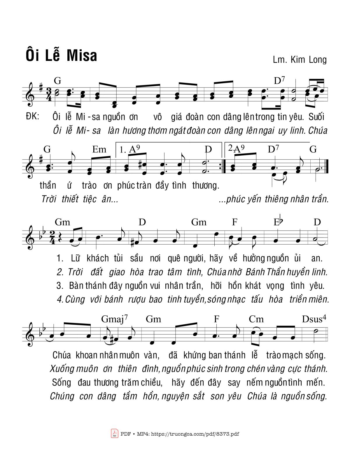 Ôi lễ Misa nguồn ơn vô giá đoàn con dâng lên trong tin yêu. Suối thân ứ trào ơn phúc tràn đầy tình thương. Ôi lễ Mi-sa làn thương thơm ngát đoàn con dâng lên ngai uy linh. Chúa Trời thiết tiệc ân phúc yến thiêng nhân trần.