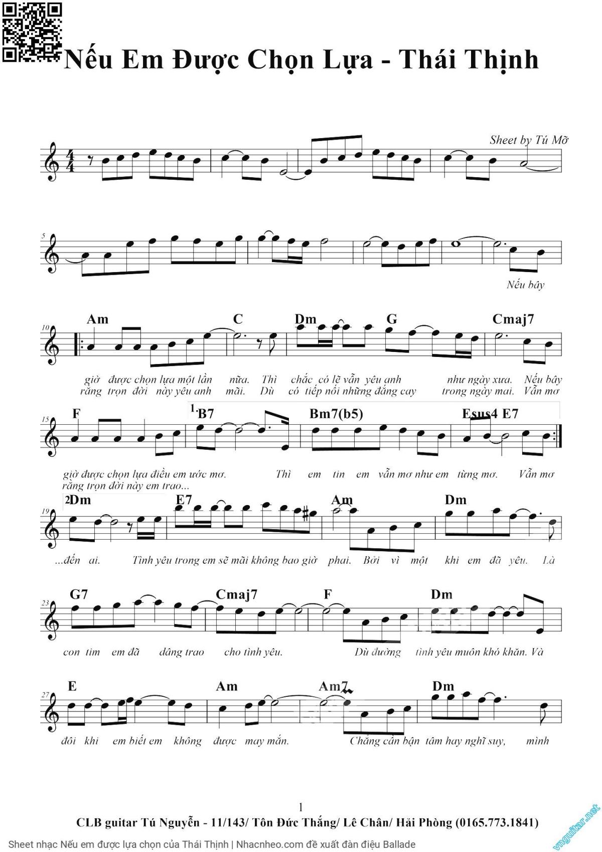 Chọn nút dấu + để tăng tông lên nửa cung, nút dấu - để giảm tông xuống nửa cung. Rê chuột vào hợp âm để xem các thế bấm hợp âm của bài hát Nếu em được lựa chọn.