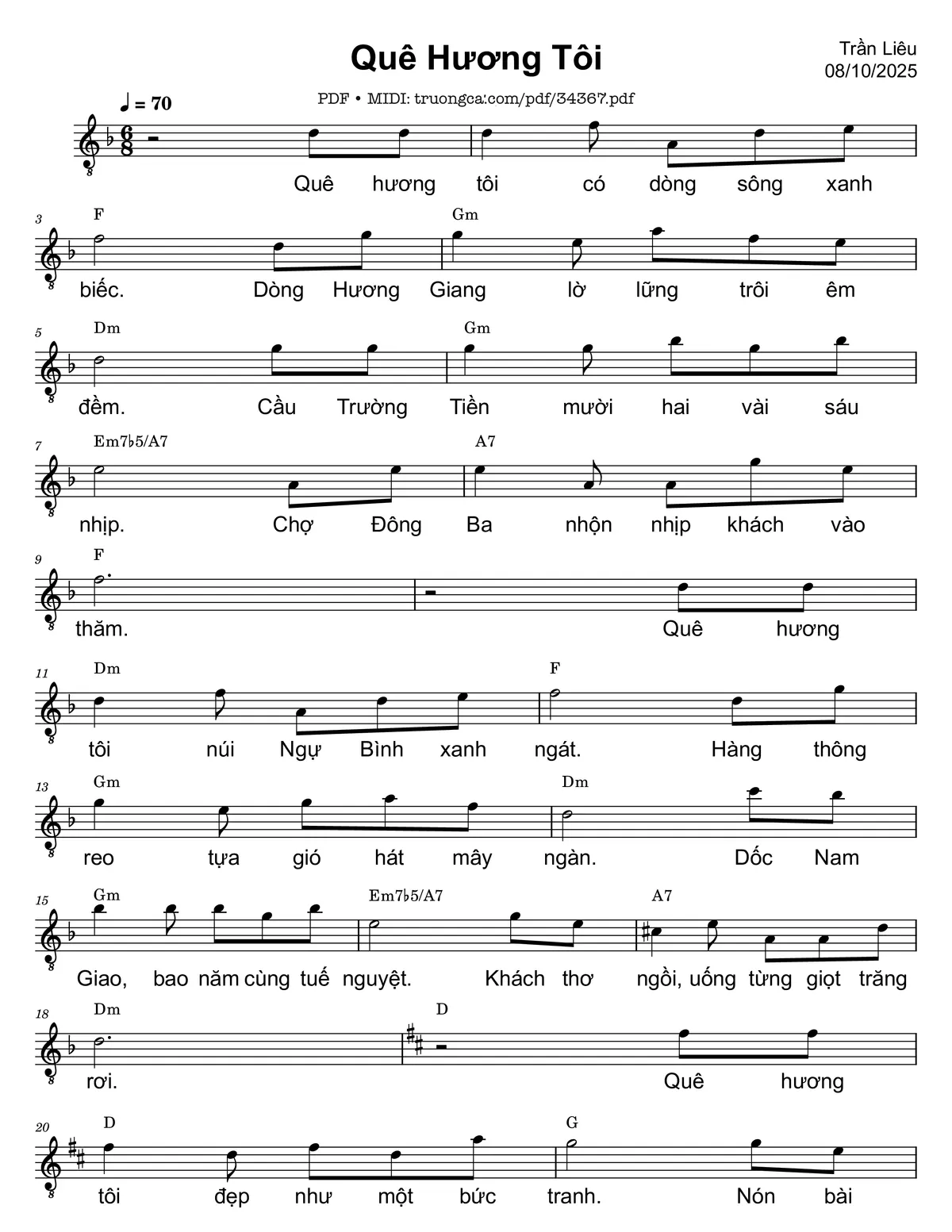 Trần Liêu Quê hương tôi có dòng sông xanh biếc Dòng Hương Giang lờ lững trôi êm đềm [PDF] [Sheet] [Lời H.A] [Mp4/Midi]