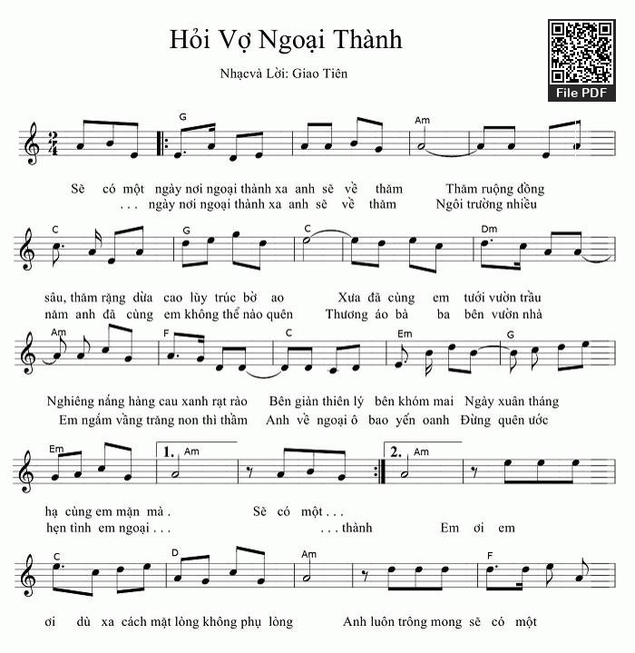 Chọn nút dấu + để tăng tông lên nửa cung, nút dấu - để giảm tông xuống nửa cung. Rê chuột vào hợp âm để xem các thế bấm hợp âm của bài hát Hỏi vợ ngoại thành.