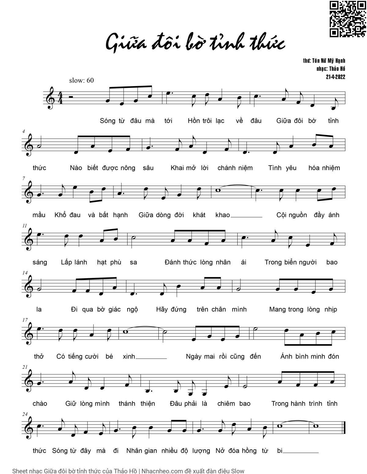 Phần nghe hát Giữa đôi bờ tỉnh thức (Thảo Hồ) được nhúng từ Youtube, Musescore hoặc link ngoài và chịu sự kiểm soát bản quyền của bên thứ ba đó, vì vậy có thể bị xóa hoặc chèn quảng cáo bất kỳ lúc nào. Nếu bạn không nghe - xem được ca sĩ hát tức là đã bị Youtube hoặc Musescore kiểm soát.