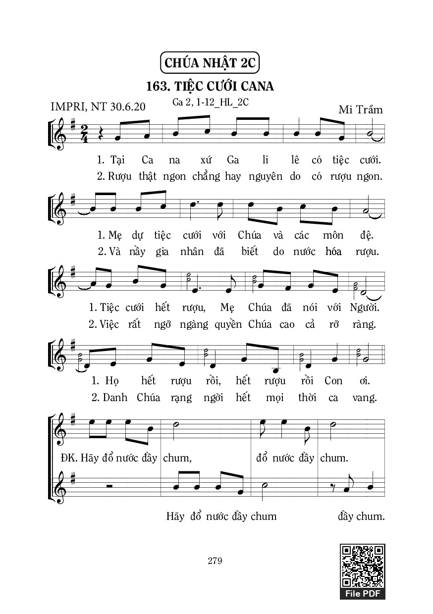 Điệp khúc. Hãy đổ nước đầy chum, đổ nước đầy chum. Hãy thưởng thức rượu ngon, nước hóa rượu ngon. Hãy đổ nước đầy chum, nước hóa rượu ngon. Đó phép lạ đầu tiên. Các môn đệ tin Người.