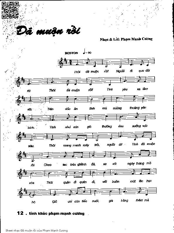 Phạm Mạnh Cương Thôi đã muộn rồi người đi qua đời tôi [PDF] [Sheet] [Lời H.A] [Mp4/Midi]