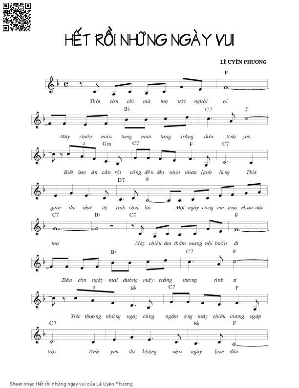 Phần nghe hát Hết rồi những ngày vui (Lê Uyên Phương) được nhúng từ Youtube, Musescore hoặc link ngoài và chịu sự kiểm soát bản quyền của bên thứ ba đó, vì vậy có thể bị xóa hoặc chèn quảng cáo bất kỳ lúc nào. Nếu bạn không nghe - xem được ca sĩ hát tức là đã bị Youtube hoặc Musescore kiểm soát.