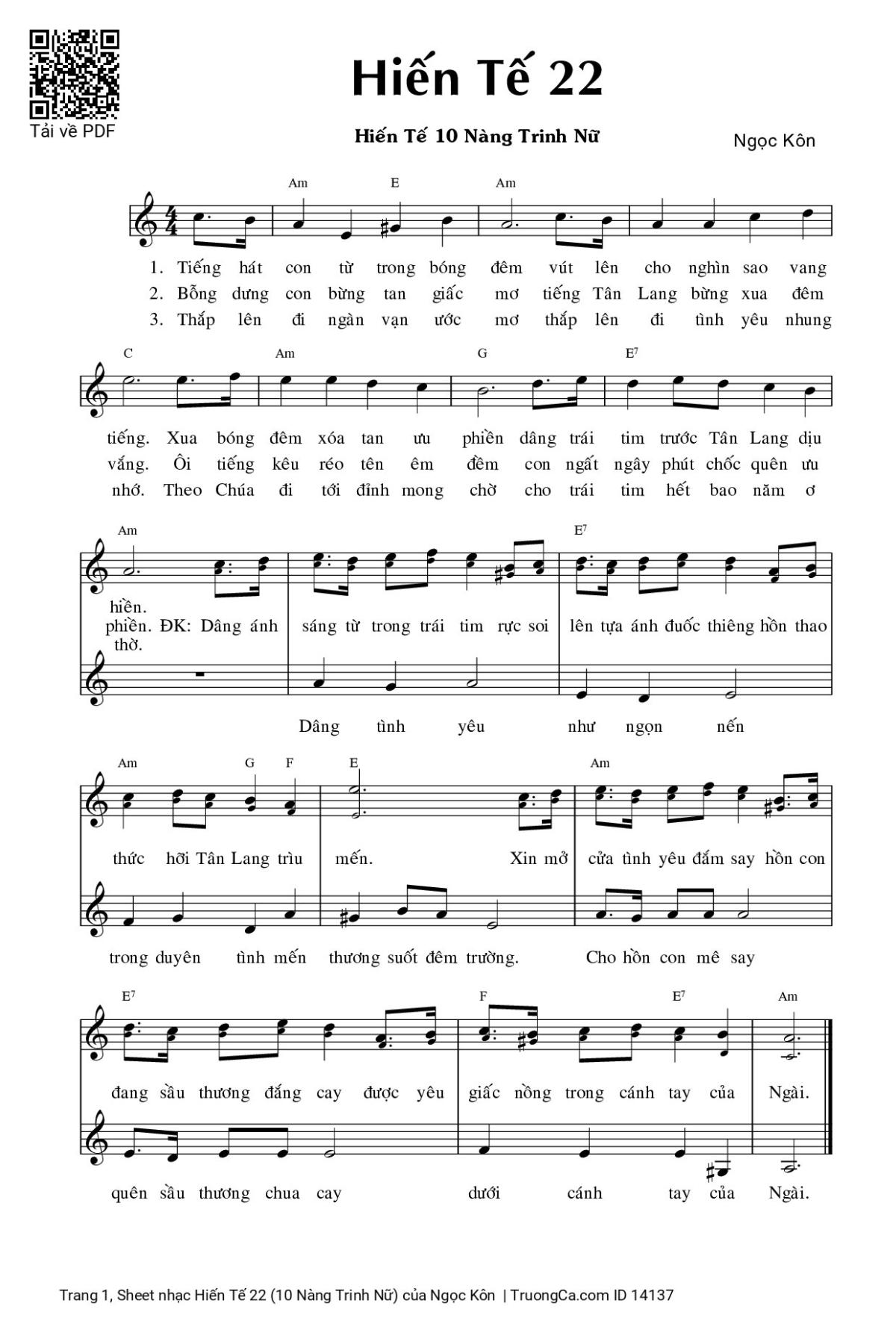 Phần nghe hát Hiến Tế 22 (10 Nàng Trinh Nữ) (Ngọc Kôn) được nhúng từ Youtube, Musescore hoặc link ngoài và chịu sự kiểm soát bản quyền của bên thứ ba đó, vì vậy có thể bị xóa hoặc chèn quảng cáo bất kỳ lúc nào. Nếu bạn không nghe - xem được ca sĩ hát tức là đã bị Youtube hoặc Musescore kiểm soát.