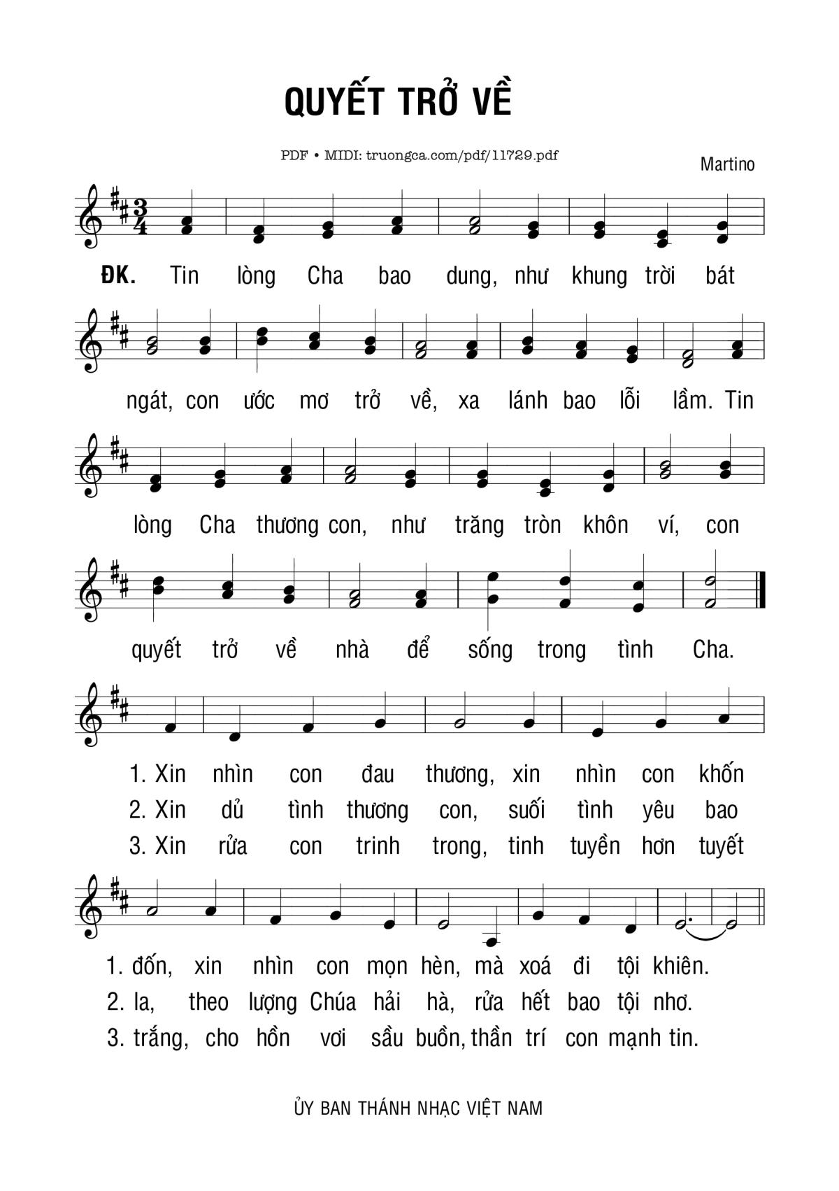 Phần nghe hát Quyết Trở Về (Martinô) được nhúng từ Youtube, Musescore hoặc link ngoài và chịu sự kiểm soát bản quyền của bên thứ ba đó, vì vậy có thể bị xóa hoặc chèn quảng cáo bất kỳ lúc nào. Nếu bạn không nghe - xem được ca sĩ hát tức là đã bị Youtube hoặc Musescore kiểm soát.
