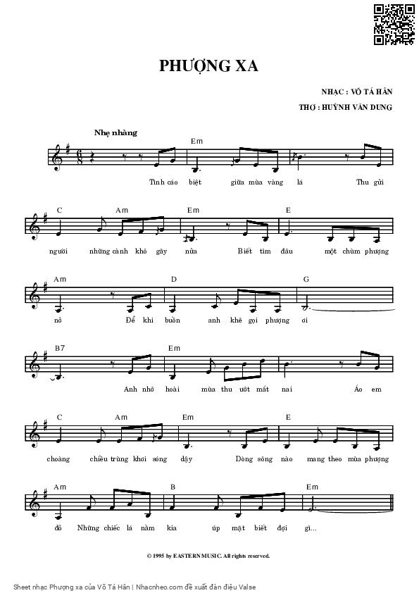 Chọn nút dấu + để tăng tông lên nửa cung, nút dấu - để giảm tông xuống nửa cung. Rê chuột vào hợp âm để xem các thế bấm hợp âm của bài hát Phượng xa.