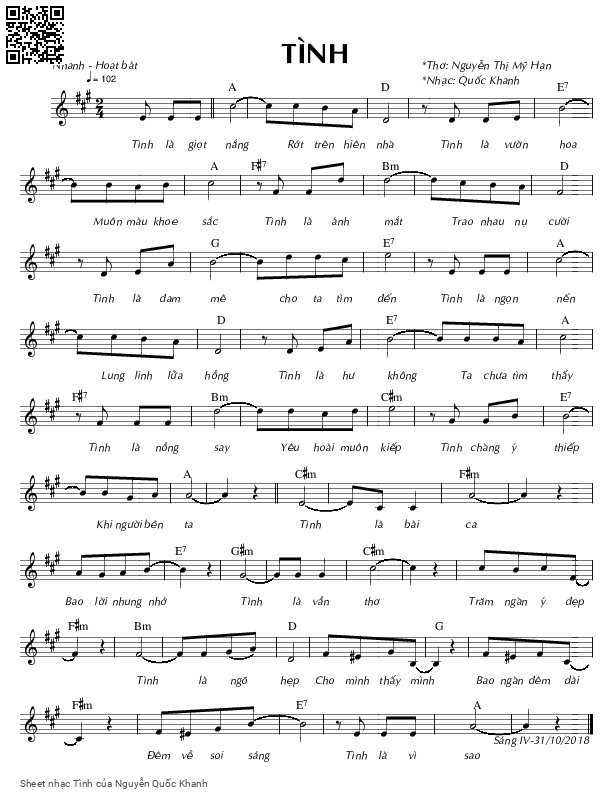 Nguyễn Quốc Khanh Tình là giọt nắng Rớt trên hiên nhà Tình là vườn hoa [PDF] [Sheet] [Lời H.A] [Mp4/Midi]