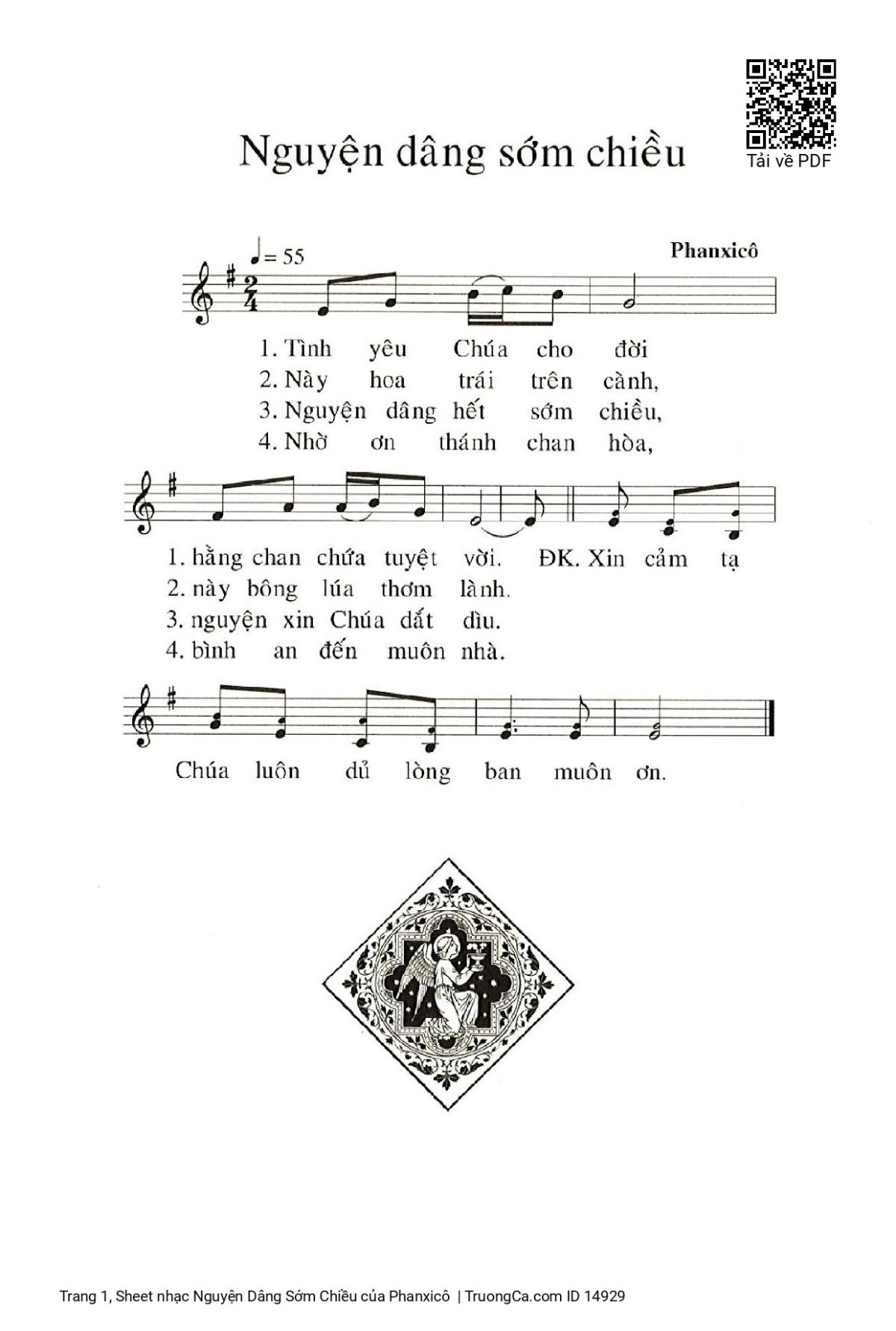Sheet nhạc có nốt Nguyện Dâng Sớm Chiều của nhạc sĩ Phanxicô và file PDF nốt nhạc đăng lên đây nhằm giúp các bạn xướng âm cho đúng nốt và hát thêm hay, chỉ mang tính chất tham khảo, không có mục đích thương mại. Bản quyền thuộc về tác giả và tổ chức nắm bản quyền, Truongca.com không giữ bất kỳ bản quyền của nội dung nào cả. Các bạn có thể tải về bản PDF chất lượng cao, gồm khuông nhạc có nốt với đường link file PDF bên trên.