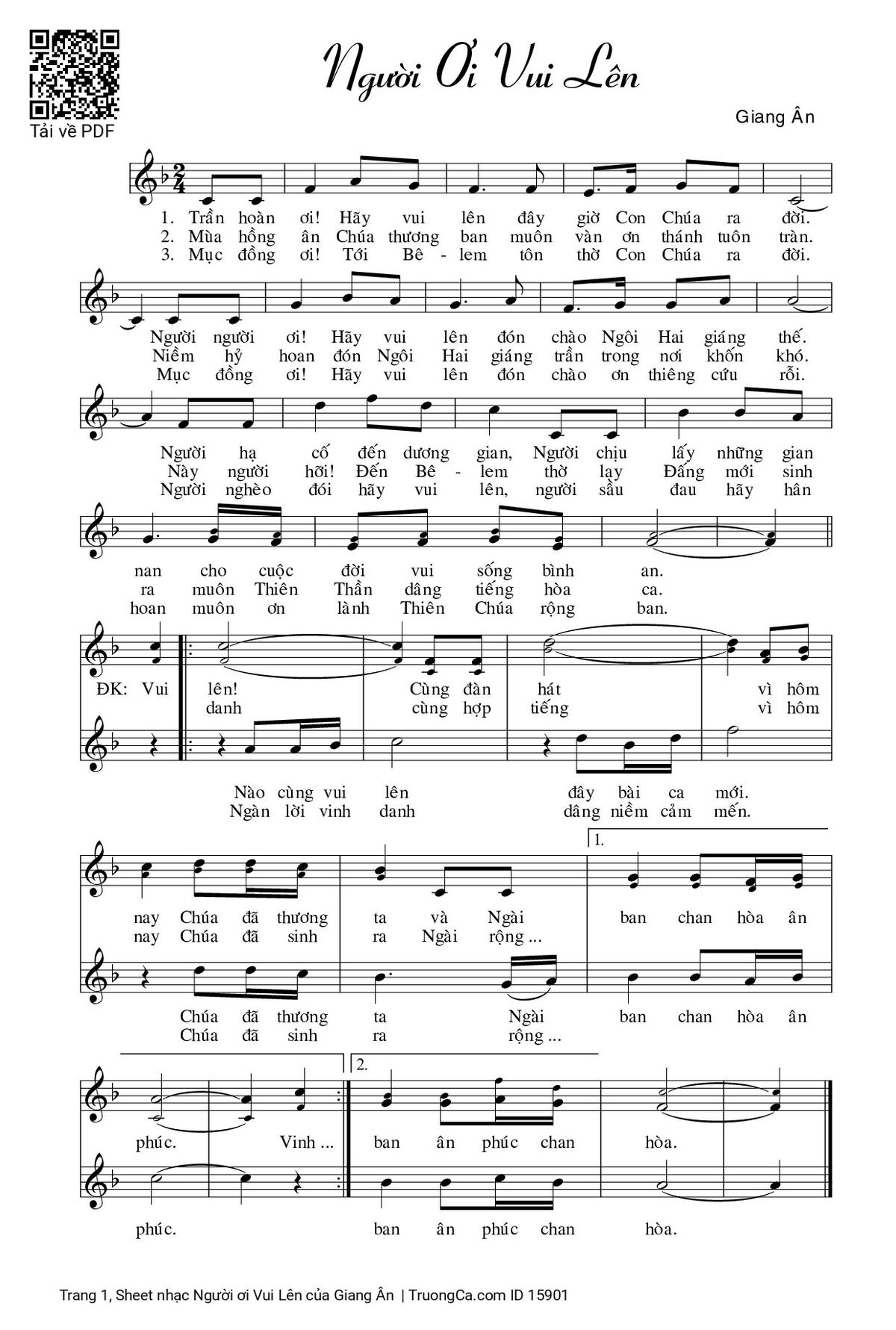 1/ Trần hoàn ơi hãy vui lên đây giờ Con Chúa ra đời. Người người ơi hãy vui lên đón chào Ngôi Hai giáng thế. Người hạ cố đến dương gian người chịu lấy những gian nan cho cuộc đời vui sống bình an