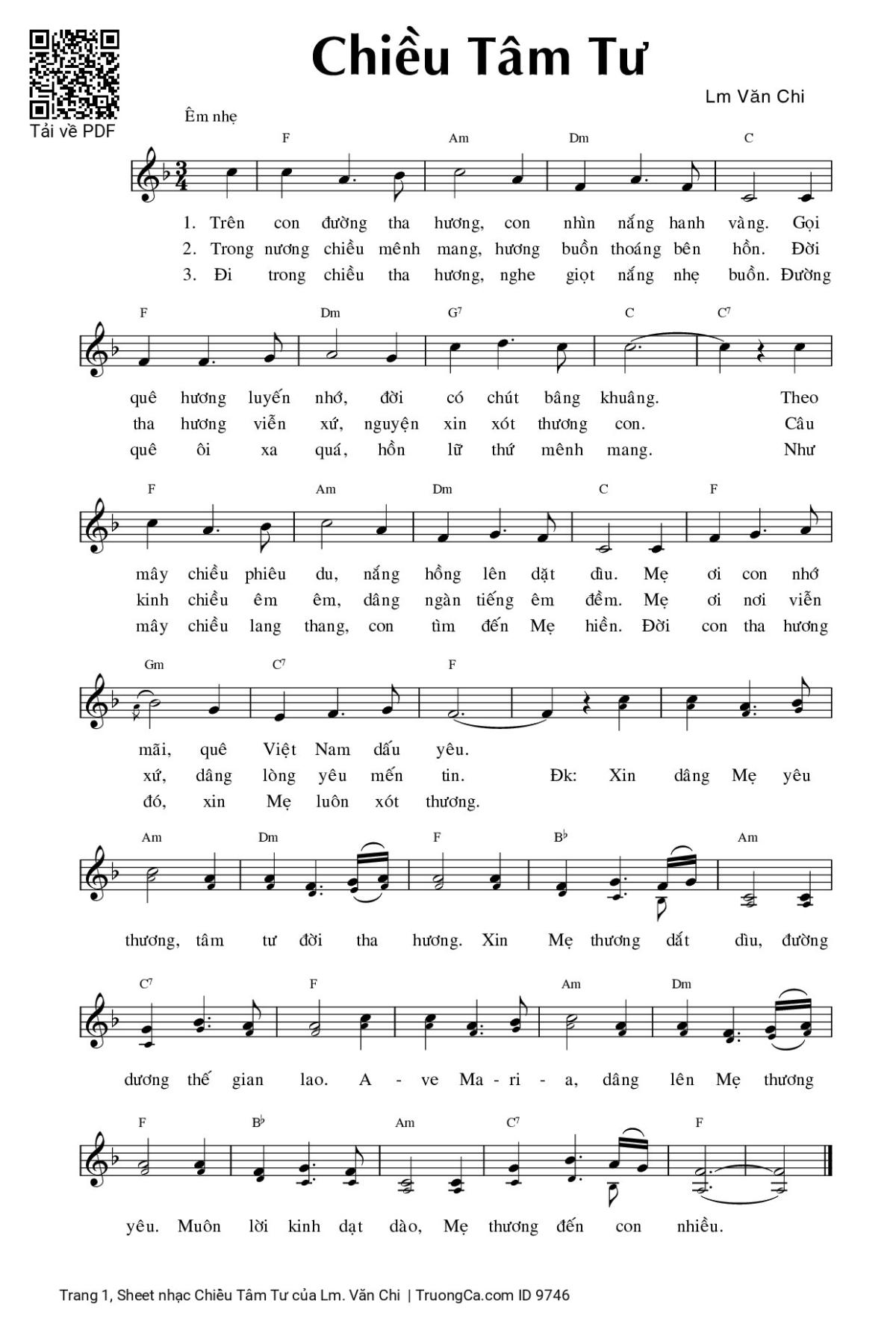 Điệp khúc: Xin dâng Mẹ yêu thương, tâm tư đời tha hương. Xin Mẹ thương dắt dìu, đường dương thế gian lao. A - ve Ma - ri - a, dâng lên Mẹ thương yêu. Muôn lời kinh dạt dào, Mẹ thương đến con nhiều.