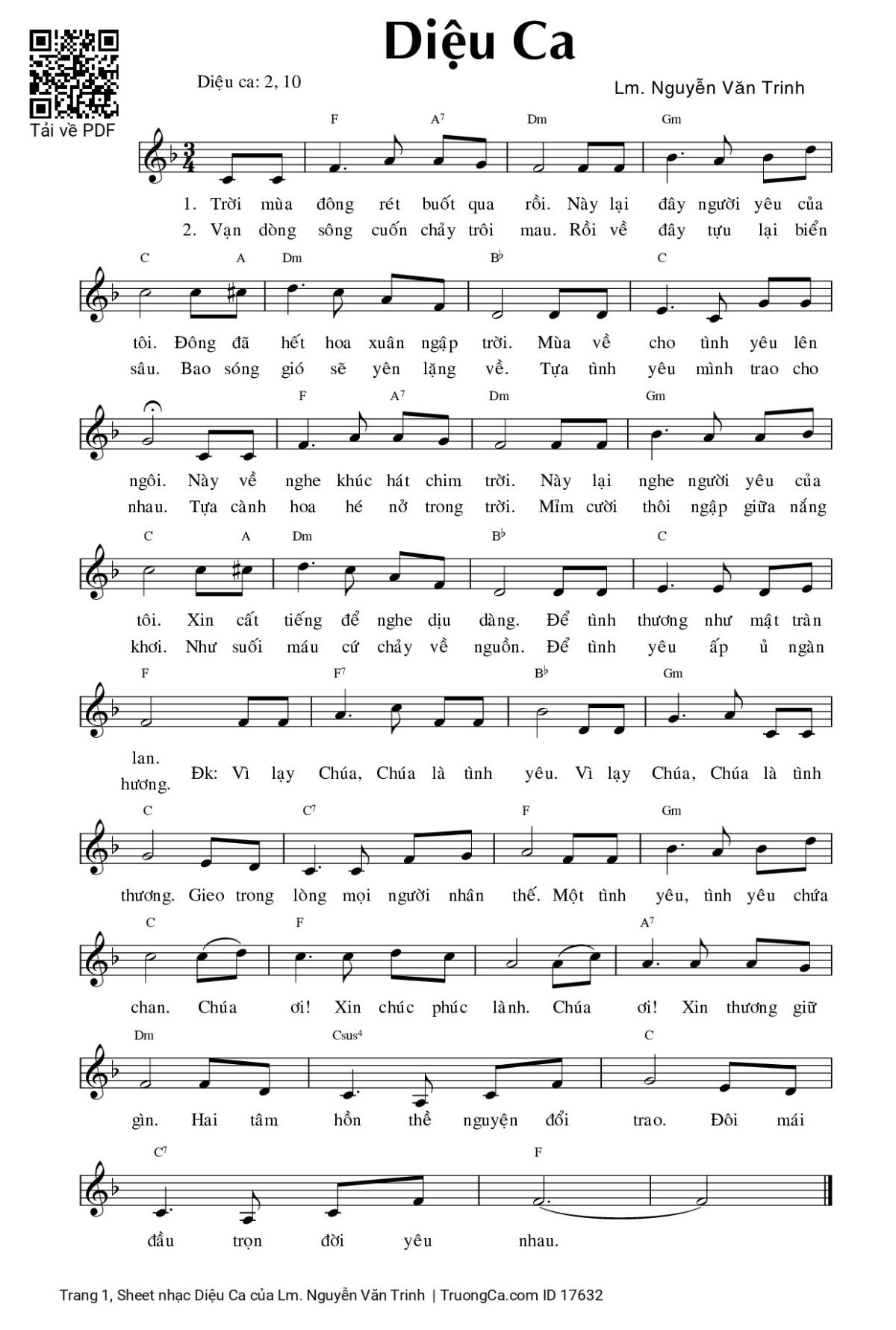 Chọn nút dấu + để tăng tông lên nửa cung, nút dấu - để giảm tông xuống nửa cung. Rê chuột vào hợp âm để xem các thế bấm hợp âm của bài hát Diệu Ca.