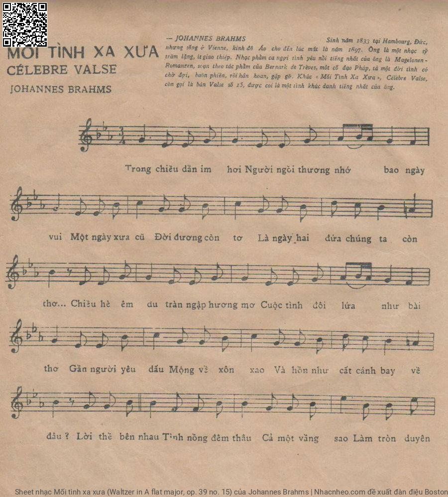 Phần nghe hát Mối tình xa xưa (Waltzer in A flat major, op. 39 no. 15) (Johannes Brahms) được nhúng từ Youtube, Musescore hoặc link ngoài và chịu sự kiểm soát bản quyền của bên thứ ba đó, vì vậy có thể bị xóa hoặc chèn quảng cáo bất kỳ lúc nào. Nếu bạn không nghe - xem được ca sĩ hát tức là đã bị Youtube hoặc Musescore kiểm soát.
