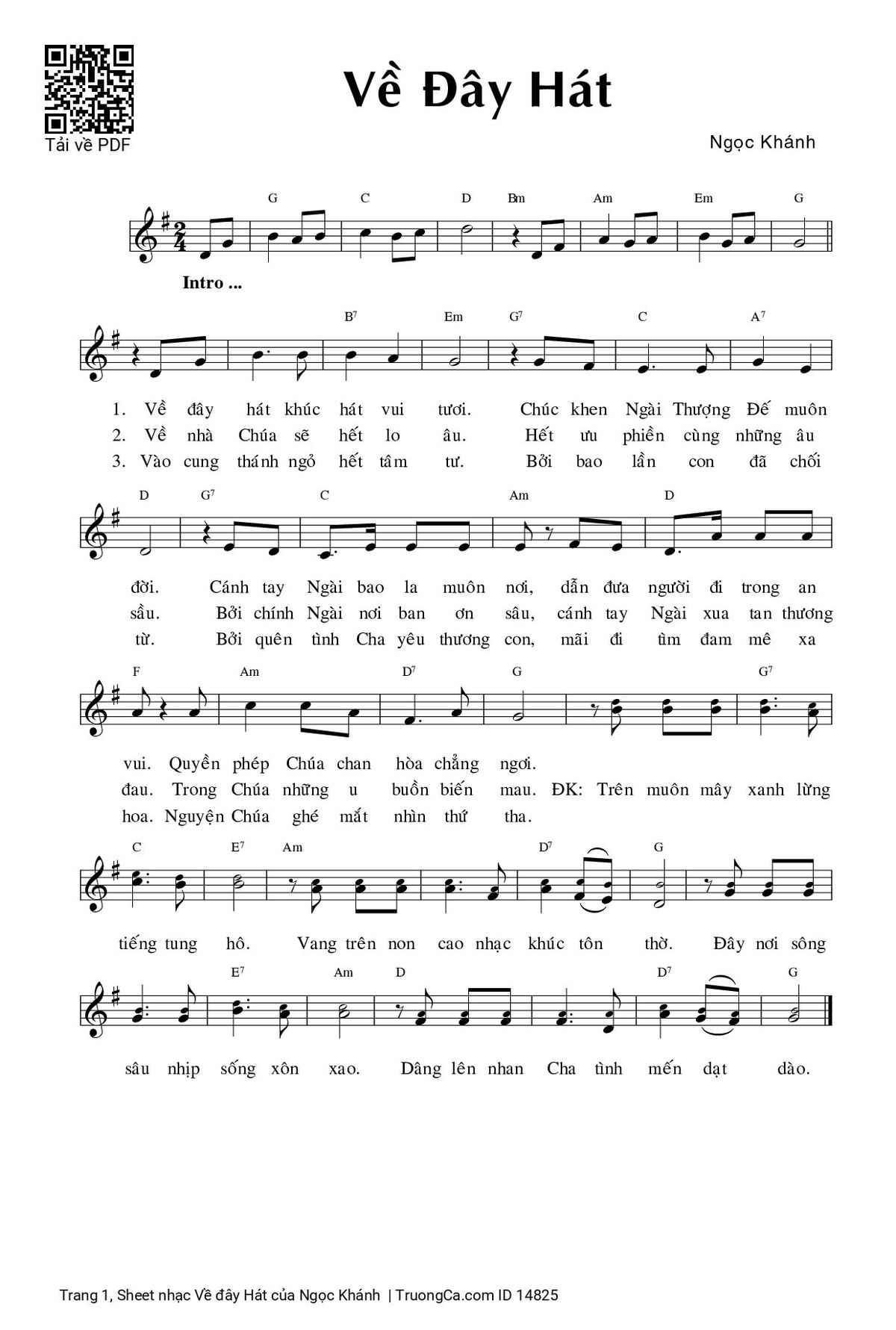 Chọn nút dấu + để tăng tông lên nửa cung, nút dấu - để giảm tông xuống nửa cung. Rê chuột vào hợp âm để xem các thế bấm hợp âm của bài hát Về đây Hát.