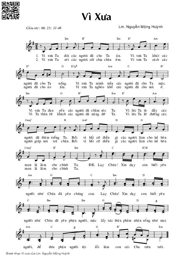 Phần nghe hát Vì xưa (Lm. Nguyễn Mộng Huỳnh) được nhúng từ Youtube, Musescore hoặc link ngoài và chịu sự kiểm soát bản quyền của bên thứ ba đó, vì vậy có thể bị xóa hoặc chèn quảng cáo bất kỳ lúc nào. Nếu bạn không nghe - xem được ca sĩ hát tức là đã bị Youtube hoặc Musescore kiểm soát.