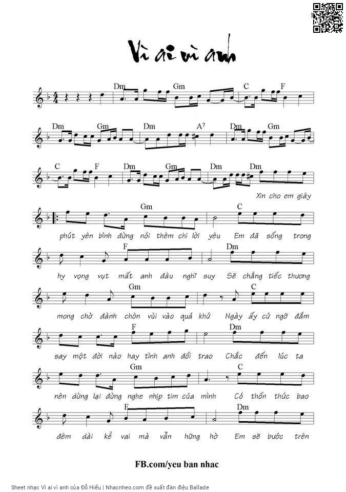 Phần nghe hát Vì ai vì anh (Đỗ Hiếu) được nhúng từ Youtube, Musescore hoặc link ngoài và chịu sự kiểm soát bản quyền của bên thứ ba đó, vì vậy có thể bị xóa hoặc chèn quảng cáo bất kỳ lúc nào. Nếu bạn không nghe - xem được ca sĩ hát tức là đã bị Youtube hoặc Musescore kiểm soát.
