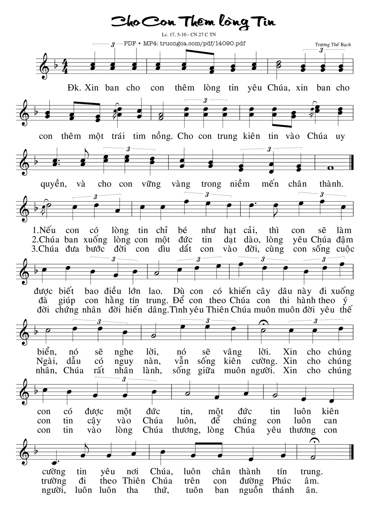Điệp khúc. Xin ban cho con thêm lòng tin yêu Chúa, xin ban cho con thêm một trái tim nồng. Cho con trung kiên tin vào Chúa uy quyền, và cho con vững vàng trong niềm mến chân thành.