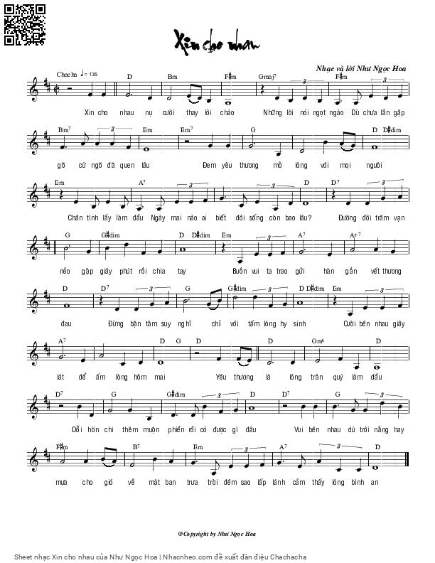 Như Ngọc Hoa Xin cho nhau nụ cười thay lời chào Những lời nói ngọt ngào [PDF] [Sheet] [Lời H.A] [Mp4/Midi]