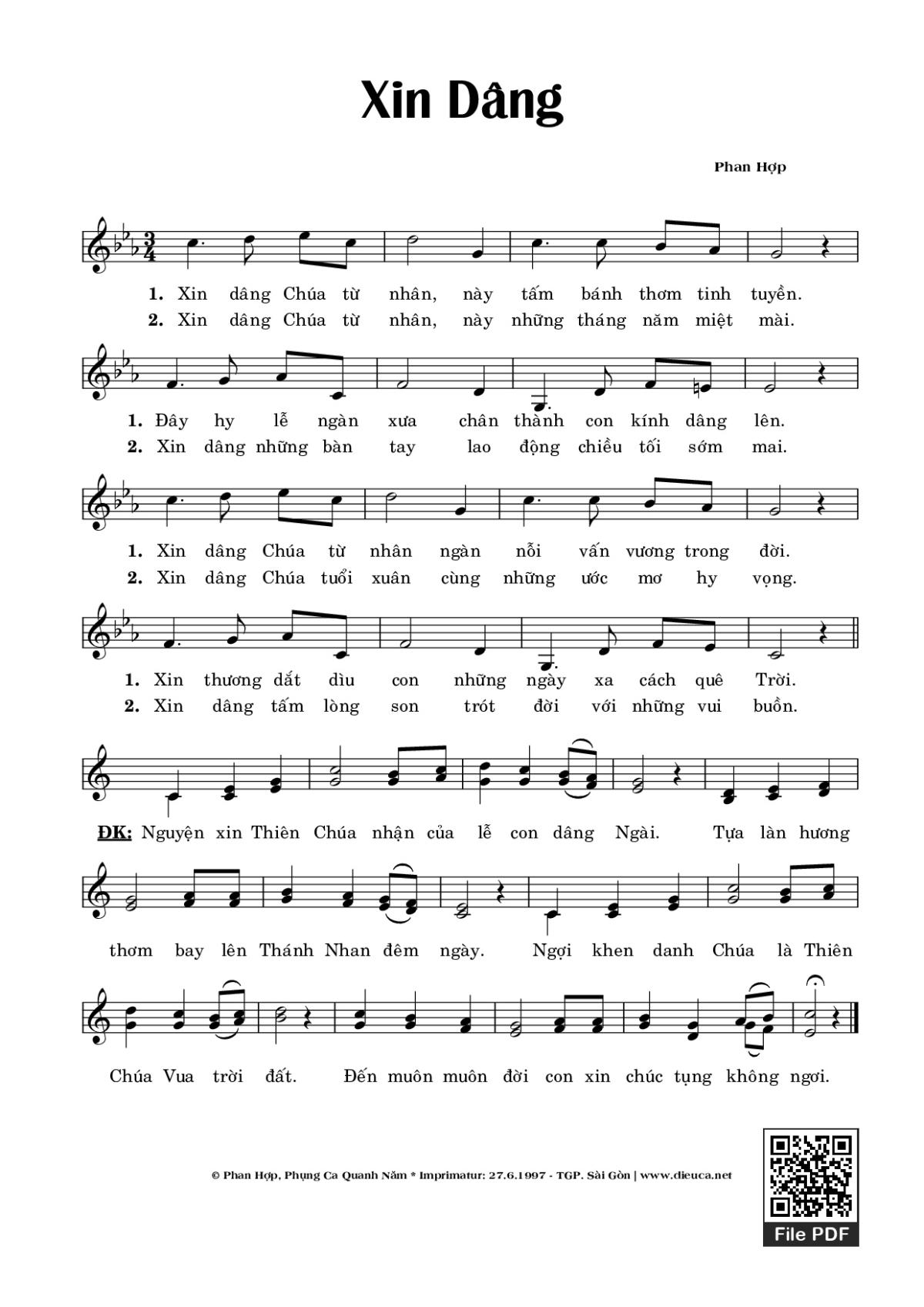 Chọn nút dấu + để tăng tông lên nửa cung, nút dấu - để giảm tông xuống nửa cung. Rê chuột vào hợp âm để xem các thế bấm hợp âm của bài hát Xin dâng.