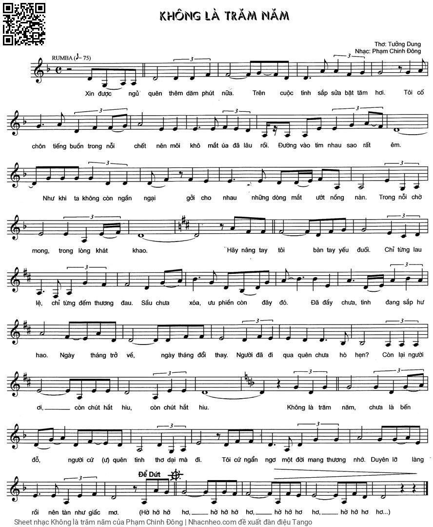 Phần nghe hát Không là trăm năm (Phạm Chinh Đông) được nhúng từ Youtube, Musescore hoặc link ngoài và chịu sự kiểm soát bản quyền của bên thứ ba đó, vì vậy có thể bị xóa hoặc chèn quảng cáo bất kỳ lúc nào. Nếu bạn không nghe - xem được ca sĩ hát tức là đã bị Youtube hoặc Musescore kiểm soát.