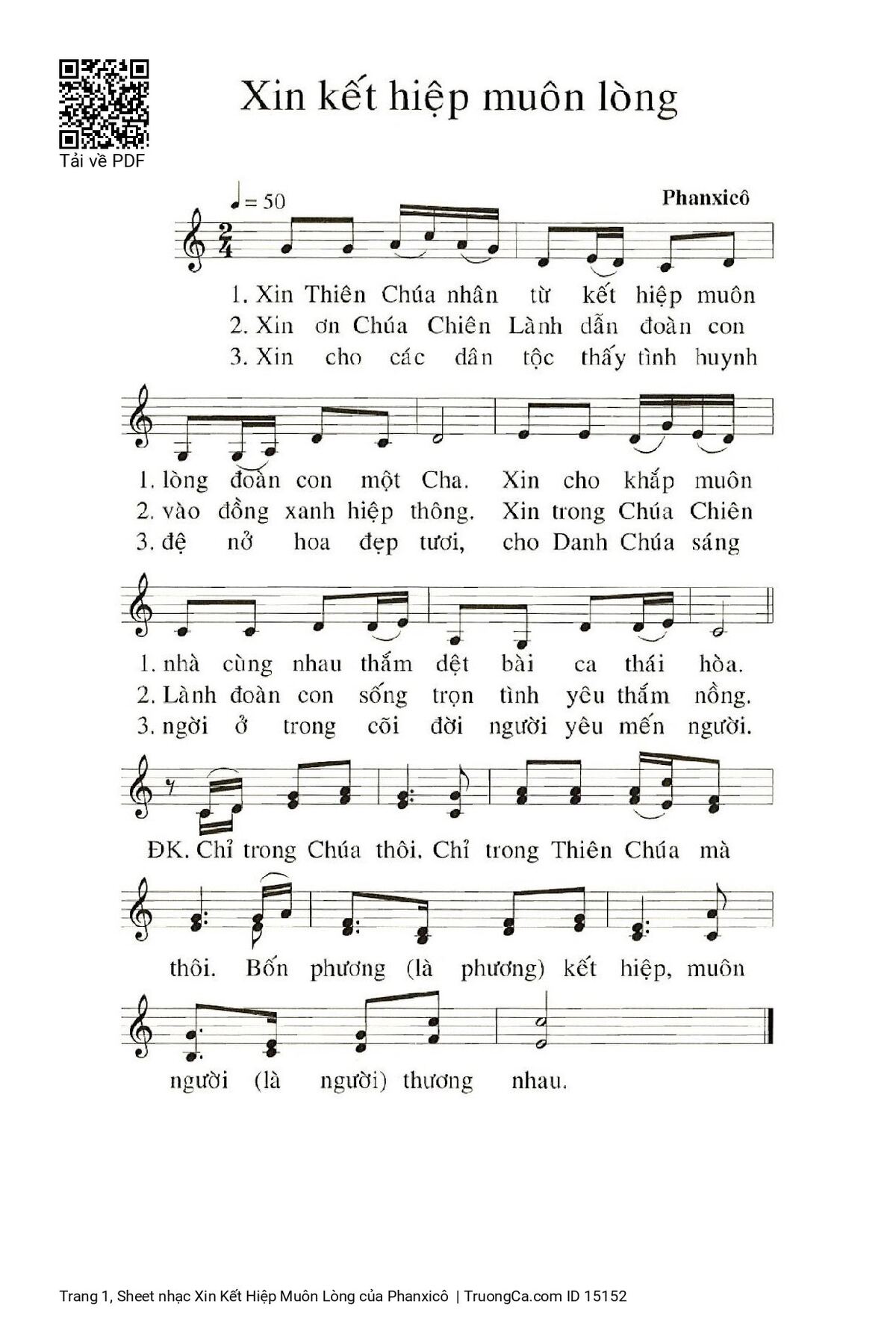 1. Xin Thiên Chúa nhân từ kết hiệp muôn lòng đoàn con một Cha. Xin cho khắp muôn nhà cùng nhau thắm dệt bài ca thái hòa.