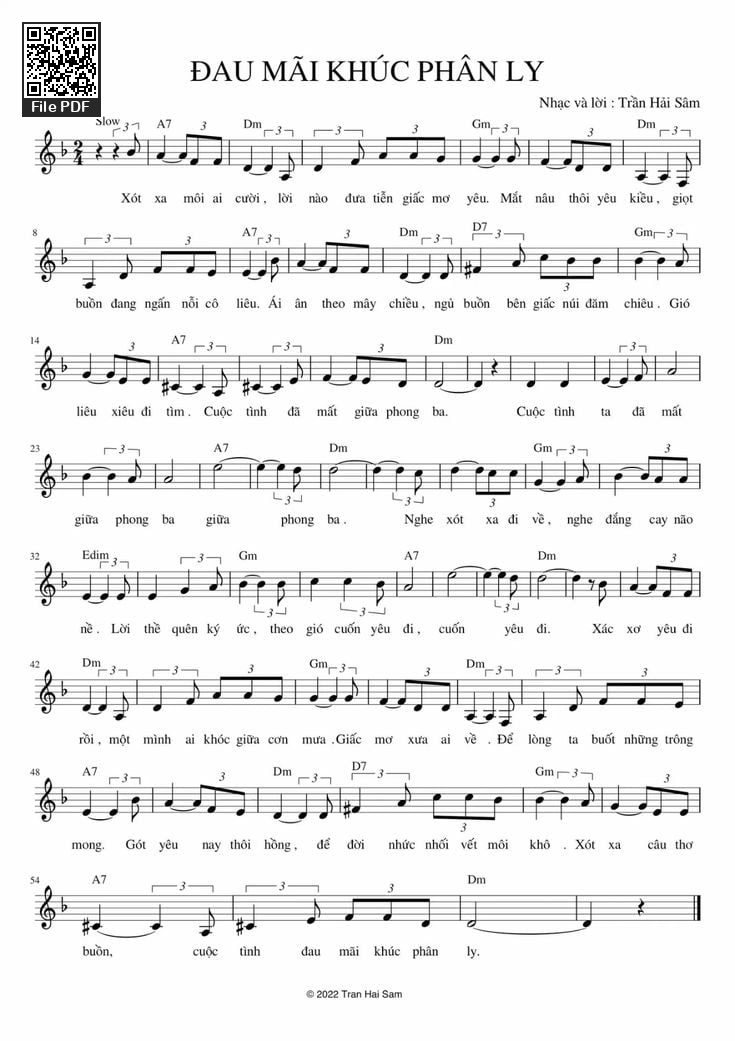 Phần nghe hát Đau mãi khúc phân ly (Trần Hải Sâm) được nhúng từ Youtube, Musescore hoặc link ngoài và chịu sự kiểm soát bản quyền của bên thứ ba đó, vì vậy có thể bị xóa hoặc chèn quảng cáo bất kỳ lúc nào. Nếu bạn không nghe - xem được ca sĩ hát tức là đã bị Youtube hoặc Musescore kiểm soát.