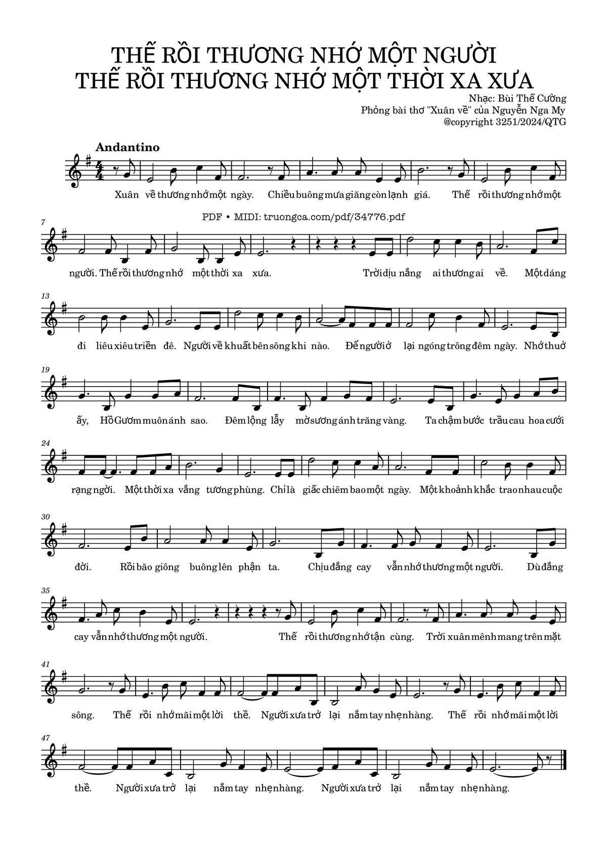 Phần nghe hát Thế rồi thương nhớ một người, thế rồi thương nhớ một thời xa xưa (Bùi Thế Cường) được nhúng từ Youtube, Musescore hoặc link ngoài và chịu sự kiểm soát bản quyền của bên thứ ba đó, vì vậy có thể bị xóa hoặc chèn quảng cáo bất kỳ lúc nào. Nếu bạn không nghe - xem được ca sĩ hát tức là đã bị Youtube hoặc Musescore kiểm soát.